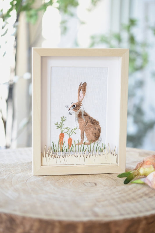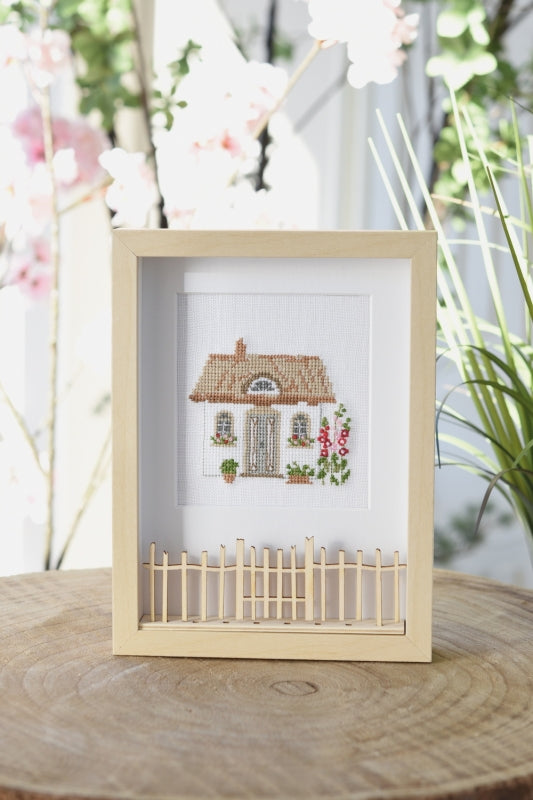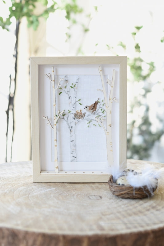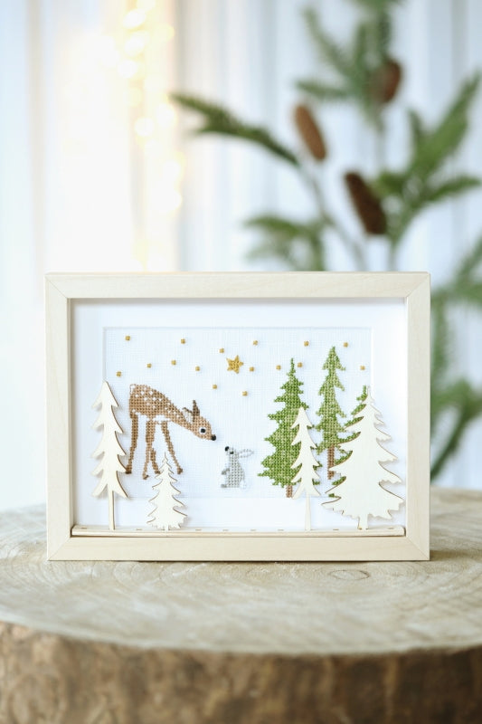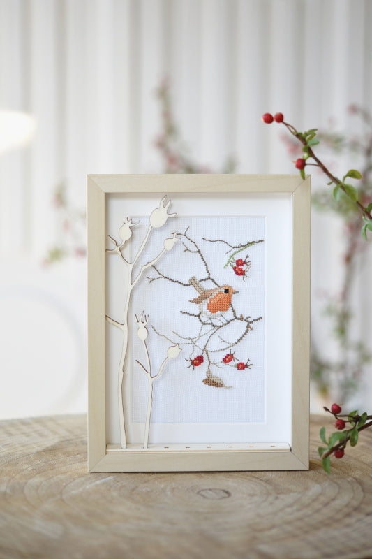 This packet includes 1 removable frame (15cm x 20 cm), 2 mounts with a square and rectangular cut-out, filigree wooden decorations (snowdrops, birch trunks, fern leaves, various floral motifs, Heart plug 4 wooden strips to use as you wish) and the cross stitch patterns for the animal designs pictured.