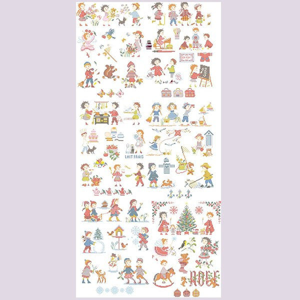 The chidren's story, designed by Perrette Samouiloff, is printed on thick paper 160g, 8 pages, with symbols and colors (Ref. DMC). It contains 50 charts.