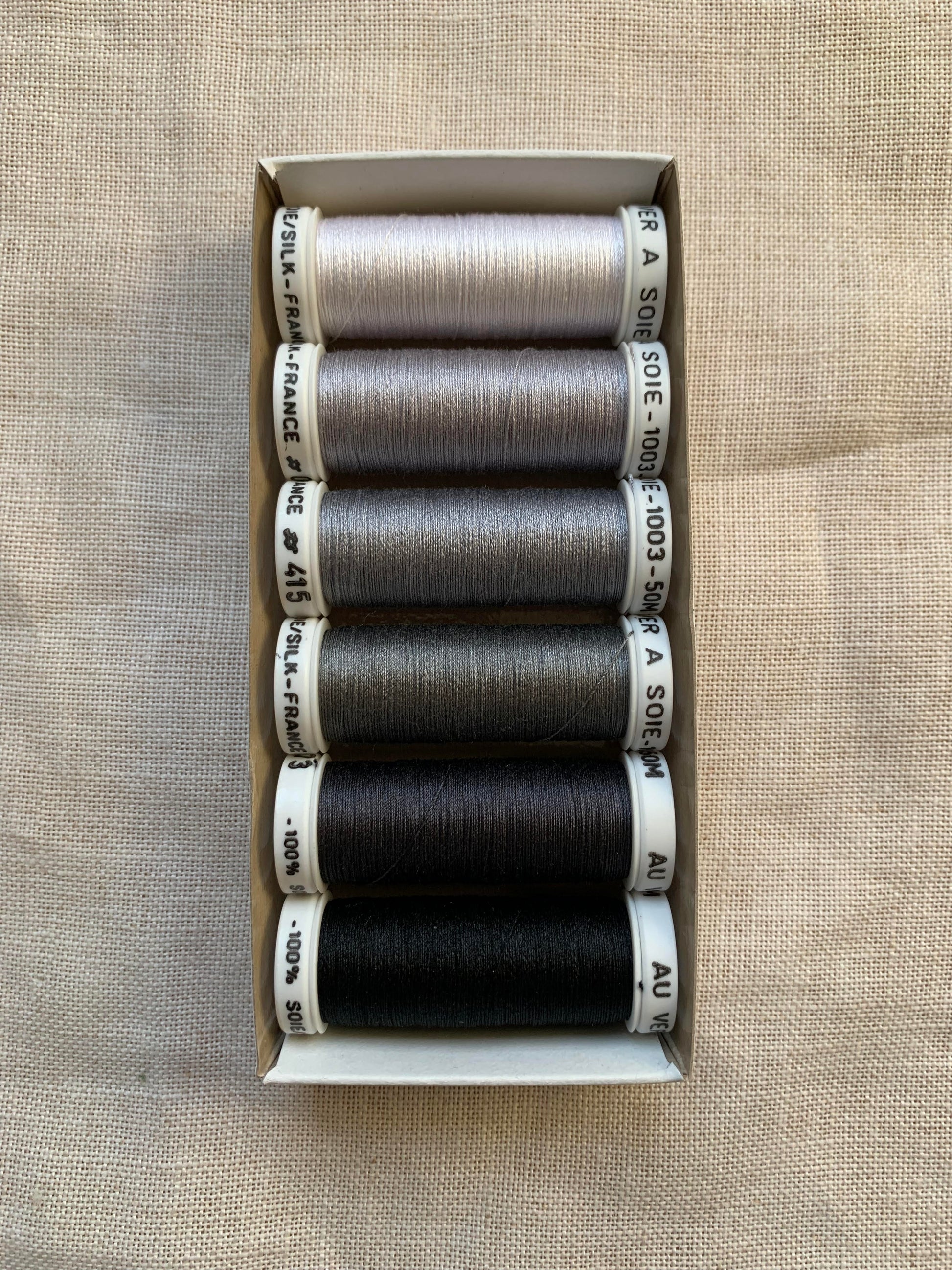 Au Ver À Soie® Soie 100/3, is a three ply highly twisted spun silk. Made in France. Uses include for embroidery, counted thread, canvas work, fine sewing, machine and long-arm quilting. The thread thickness is slightly finer than a single ply of Soie d’Alger.