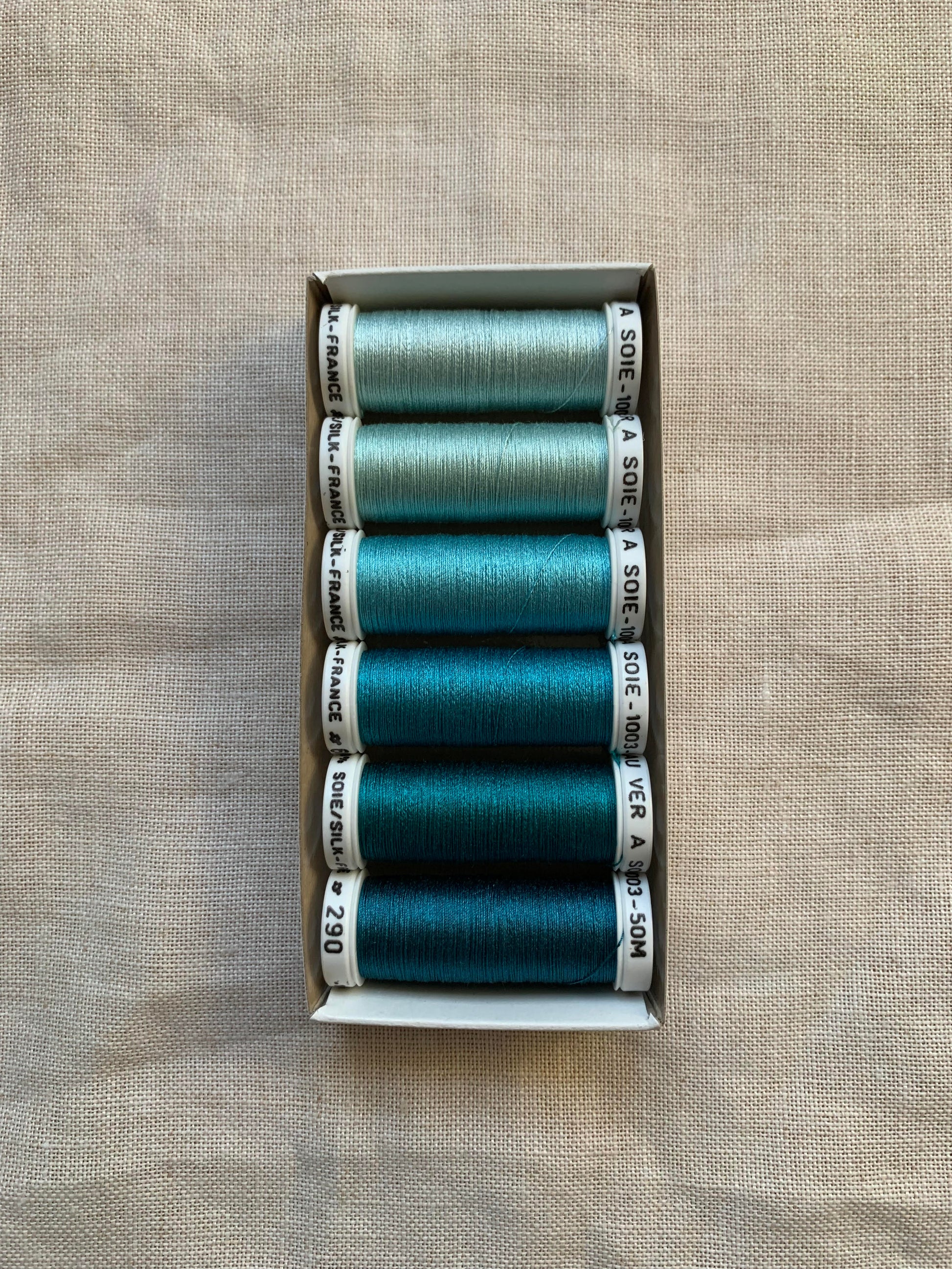 Au Ver À Soie® Soie 100/3, is a three ply highly twisted spun silk. Made in France. Uses include for embroidery, counted thread, canvas work, fine sewing, machine and long-arm quilting. The thread thickness is slightly finer than a single ply of Soie d’Alger.