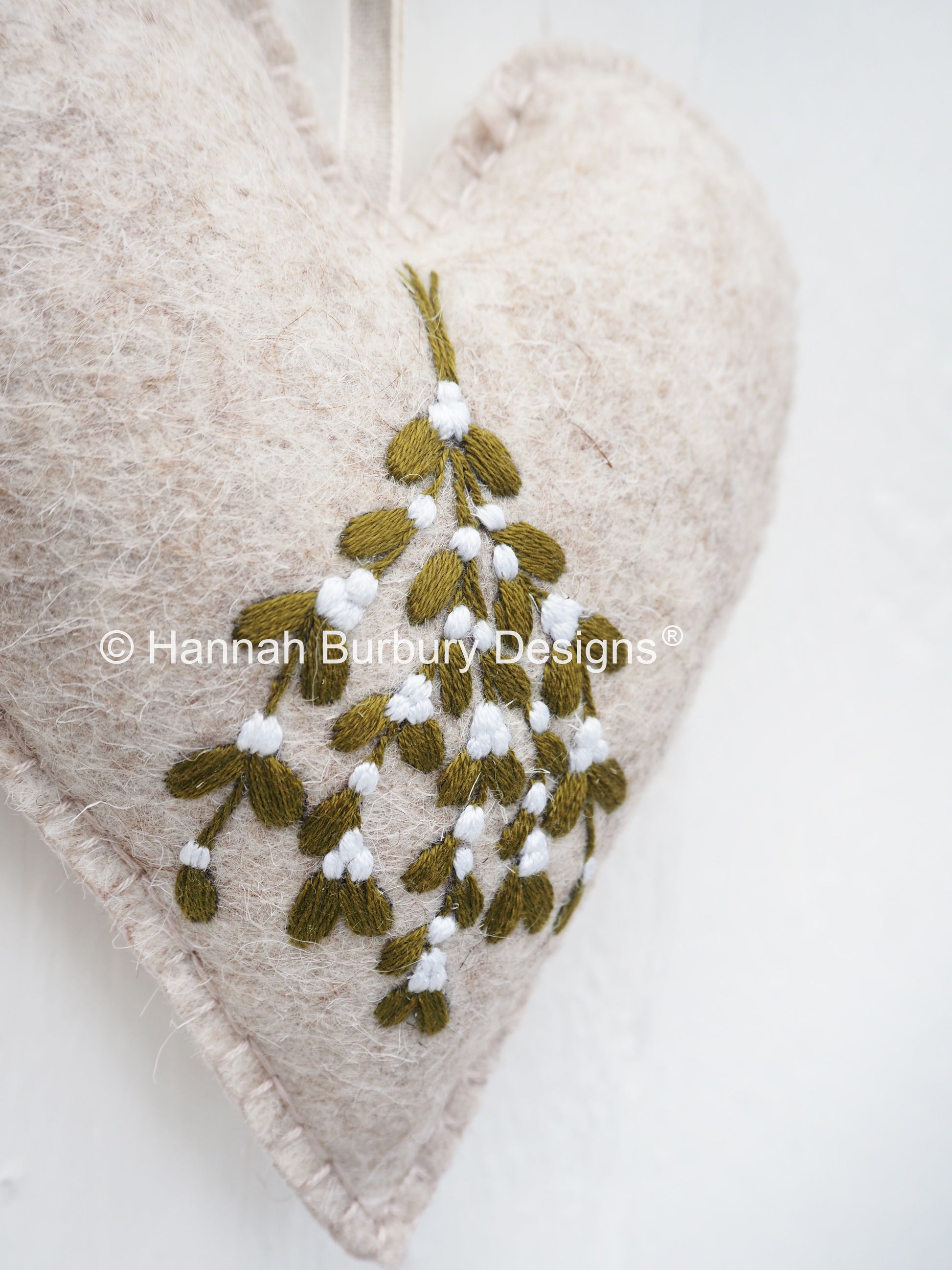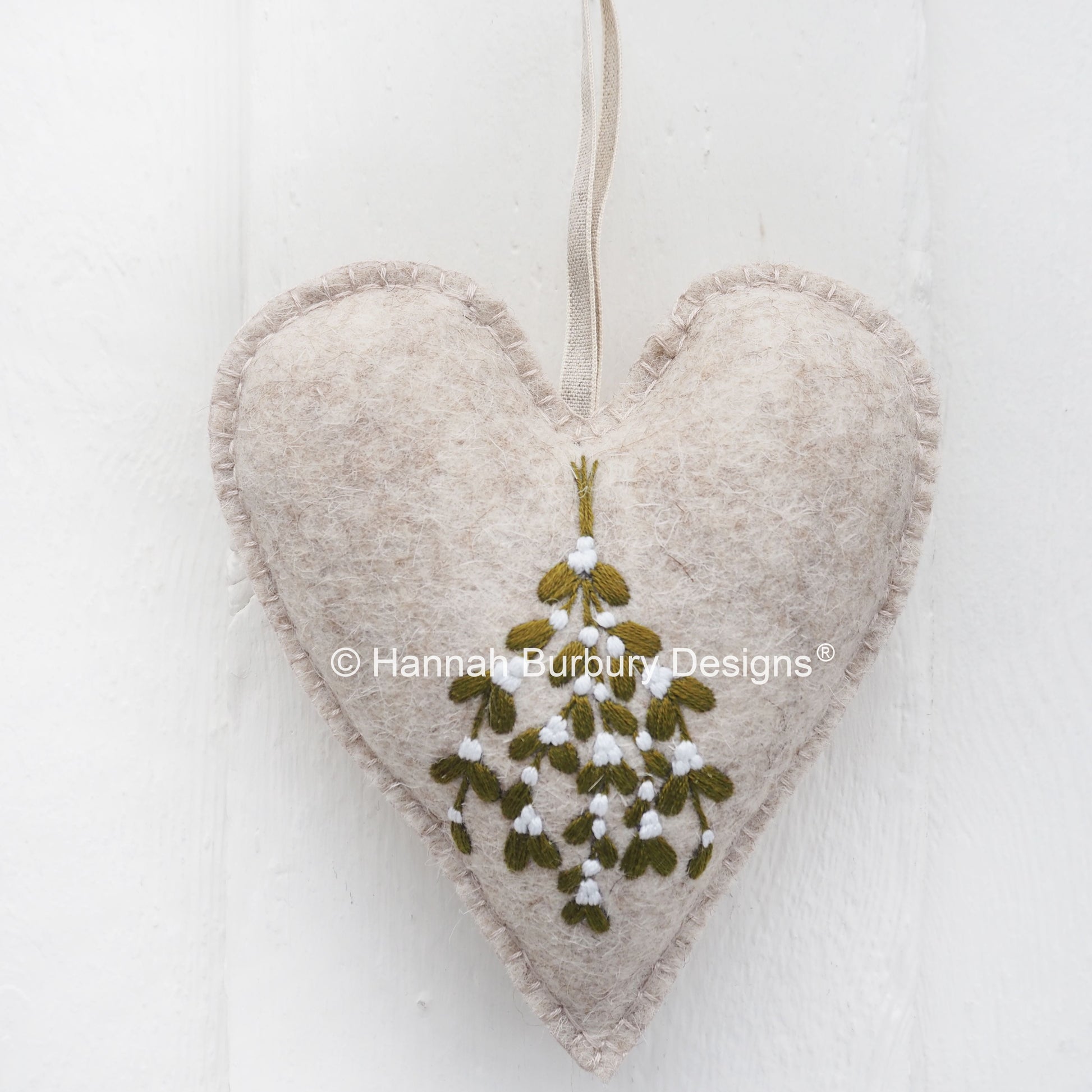 Make your own mistletoe hanging heart with this hand embroidery kit by Hannah Burbury Designs®. Made from high quality 100% wool felt and finished with natural linen ribbon. The heart will make a lovely decoration for your home or to give as a gift.