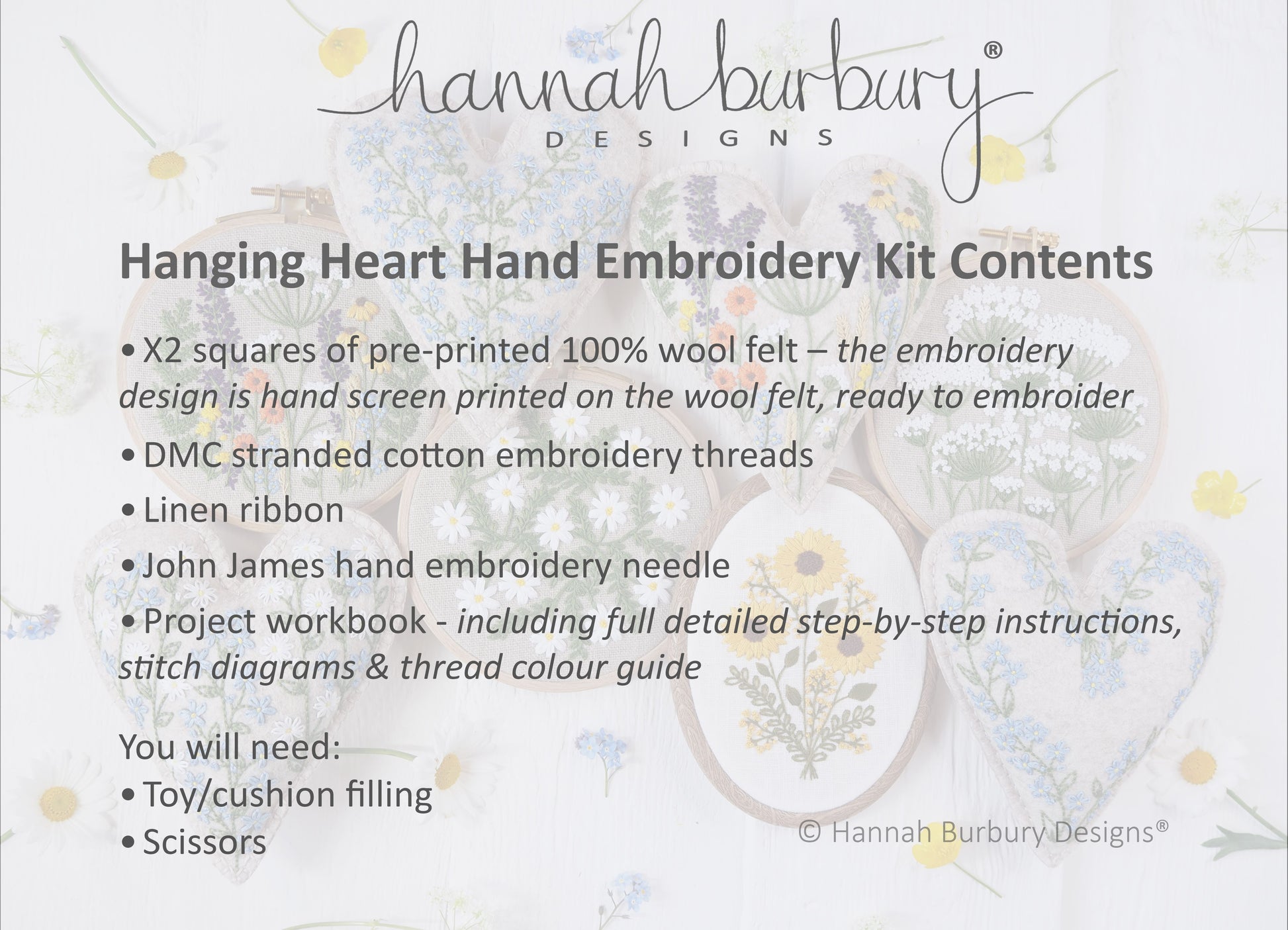 The kit includes a project workbook with a step-by-step photo guide in hand embroidering and making the hanging heart, a hand embroidery stitch guide and a thread colour and stitch guide. This is a suitable project for beginners and experienced stitchers.