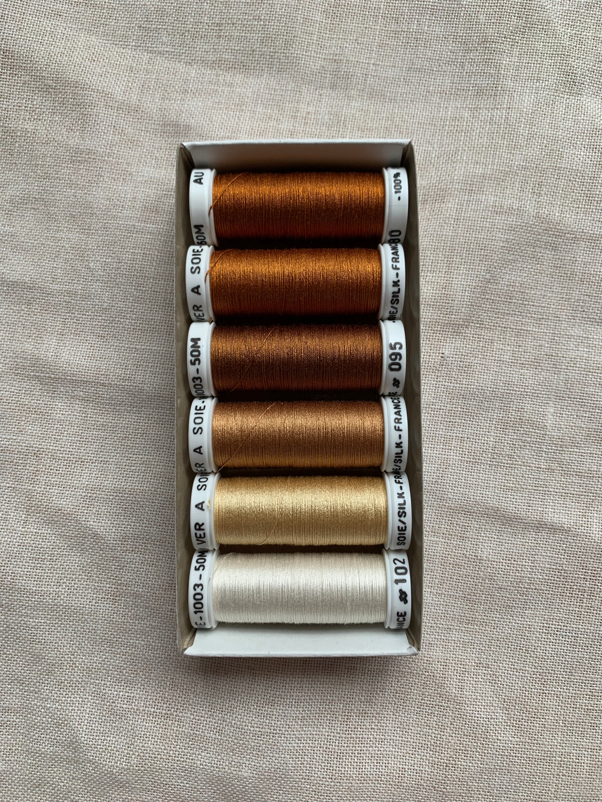 Au Ver À Soie® 1003 is a three ply highly twisted spun silk. Made in France. Uses include for embroidery, counted thread, canvas work, fine sewing, machine and long-arm quilting. The thread thickness is slightly finer than a single ply of Soie d’Alger.