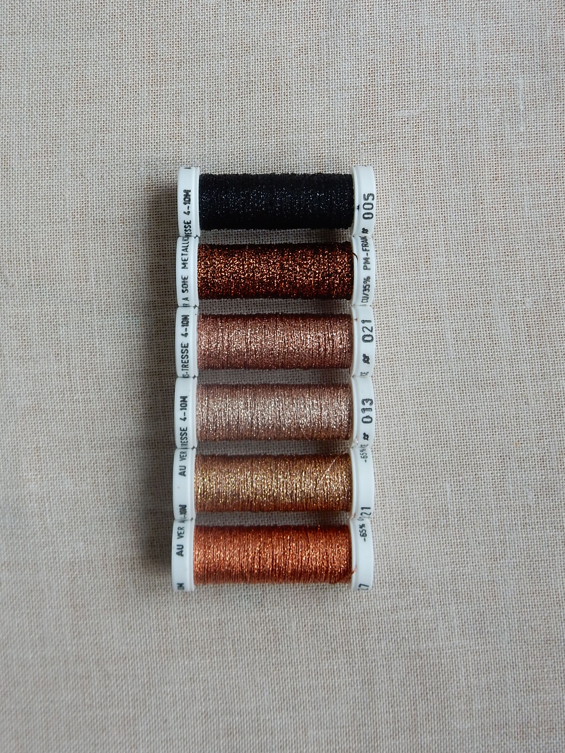 Metallic #4 soft and resistant metallic braid for hand and machine embroidery. Each of the 6 skeing has 10 meters of fiber.