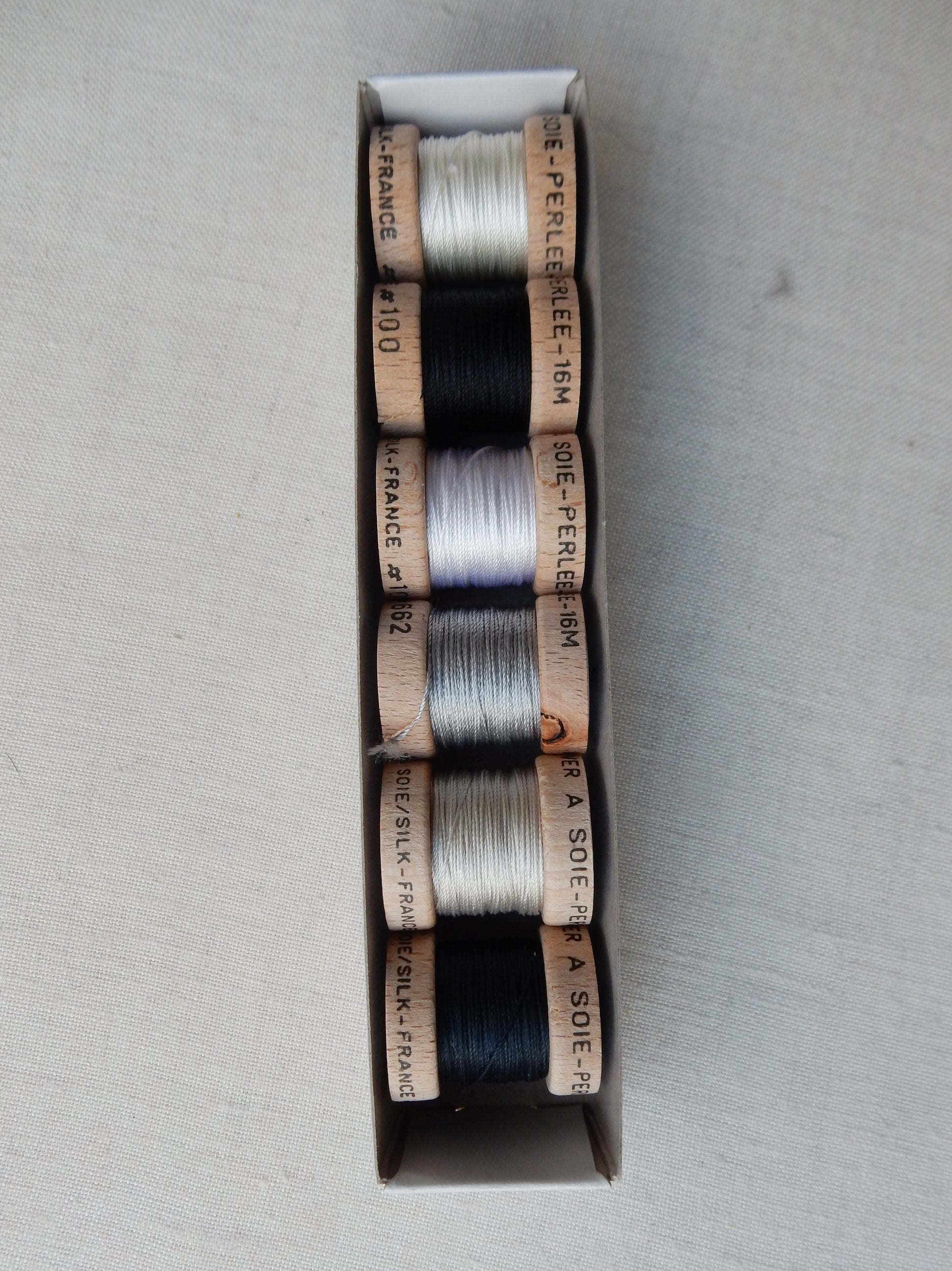 6 shades of black and white perle. 3 ply twisted filament silk that is smooth, soft and lustrous, made of raw silk. Good tensile strength and resists well to abrasion. For embroidery and miniature crochet.