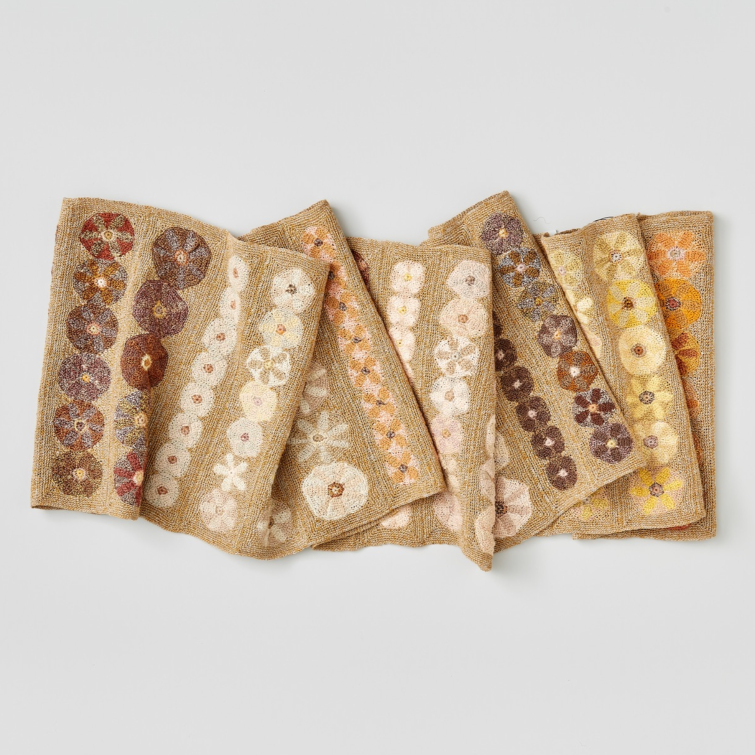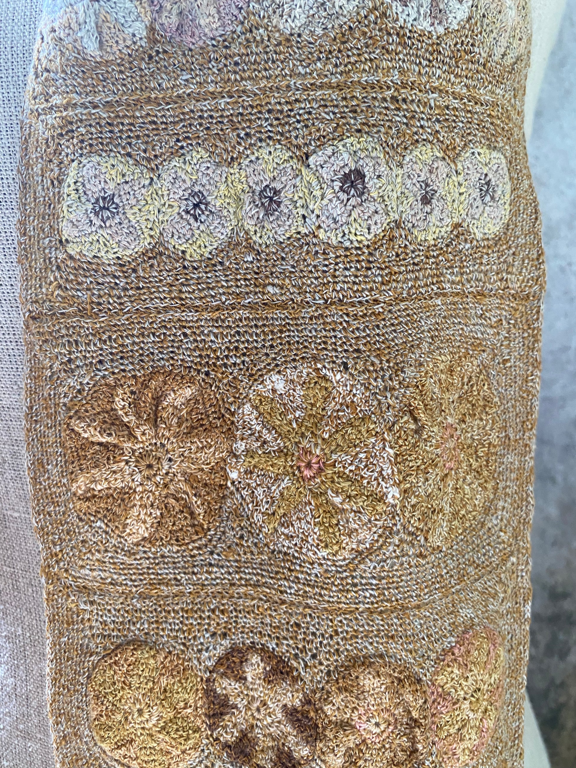 Hand crocheted linen scarf, tones of gold, tan and neutral