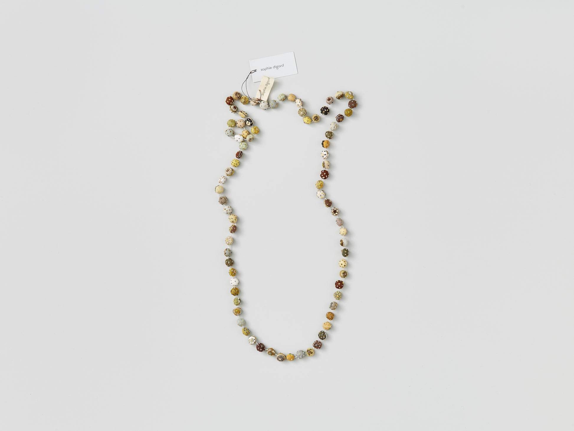 Hand-made,100% linen necklace; 15 inch diameter / 57.5cm diameter; greige, mouse brown with soft blues and golden-green tones.... There are dots and flowers stitched onto each "bead." Great length for styling single or double strand.