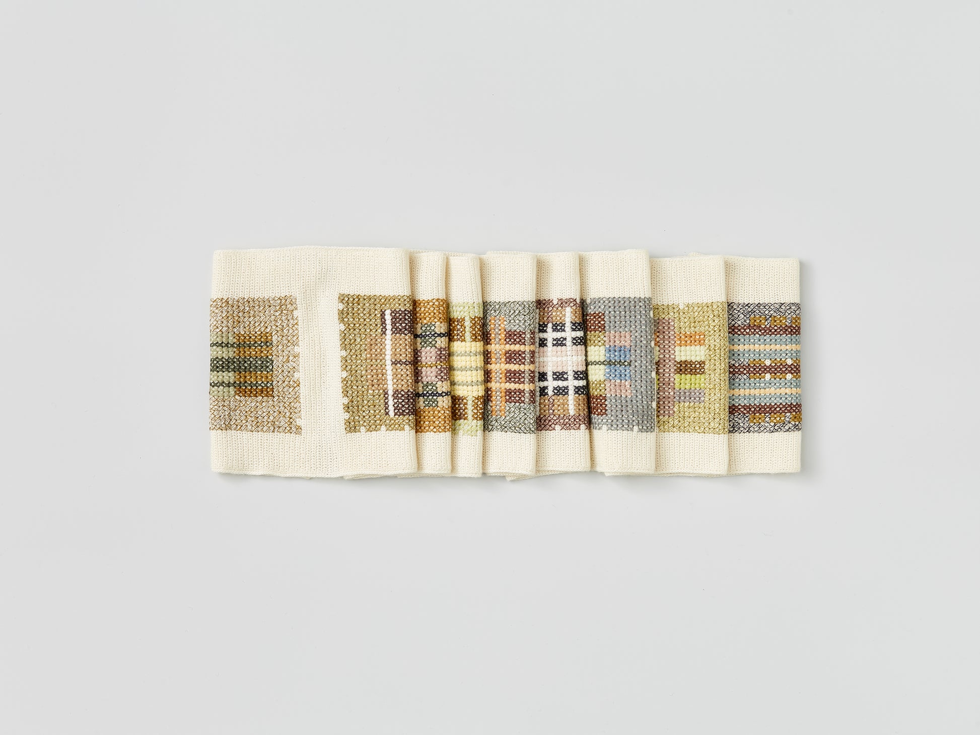 Hand-made, 100% merino wool scarf; 48 inches long x 6 inches wide; ecru background with sage green, dusty rose, mauve, orange square stitched patterns.