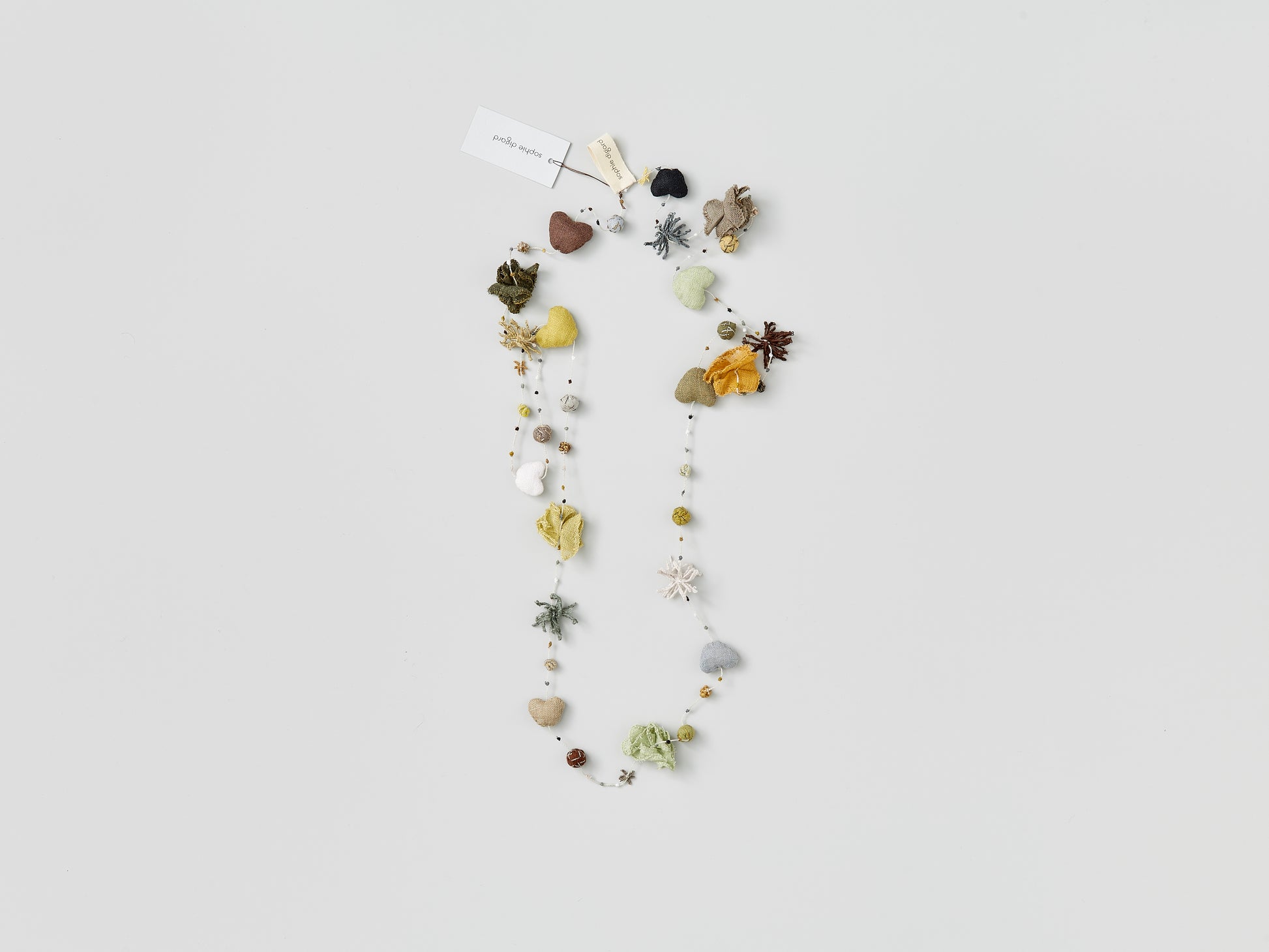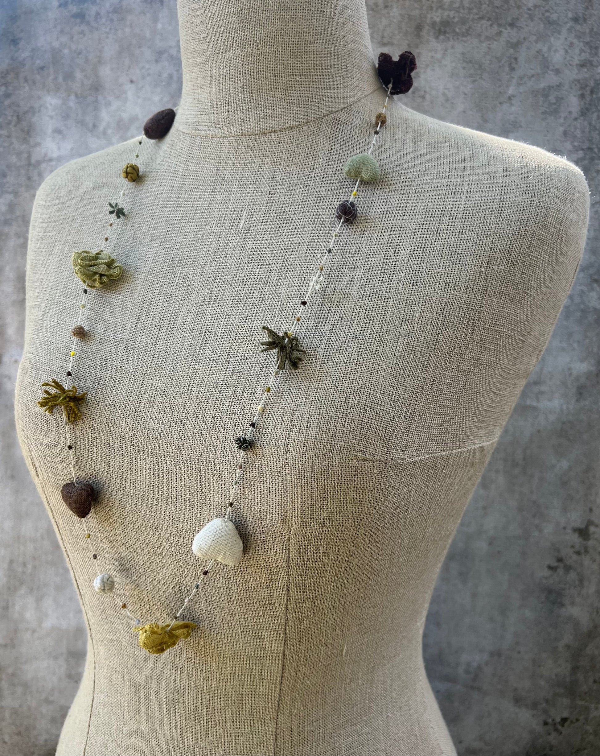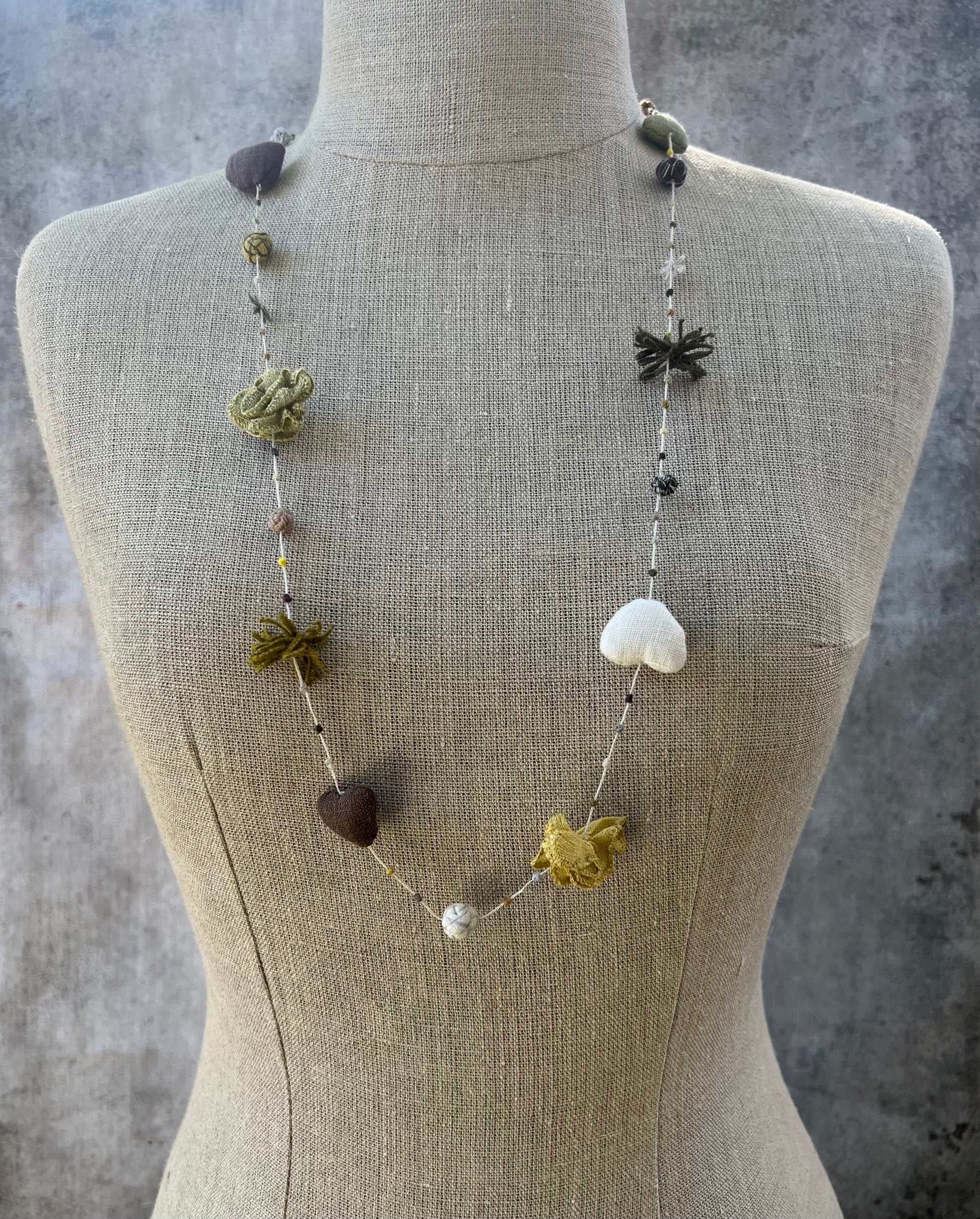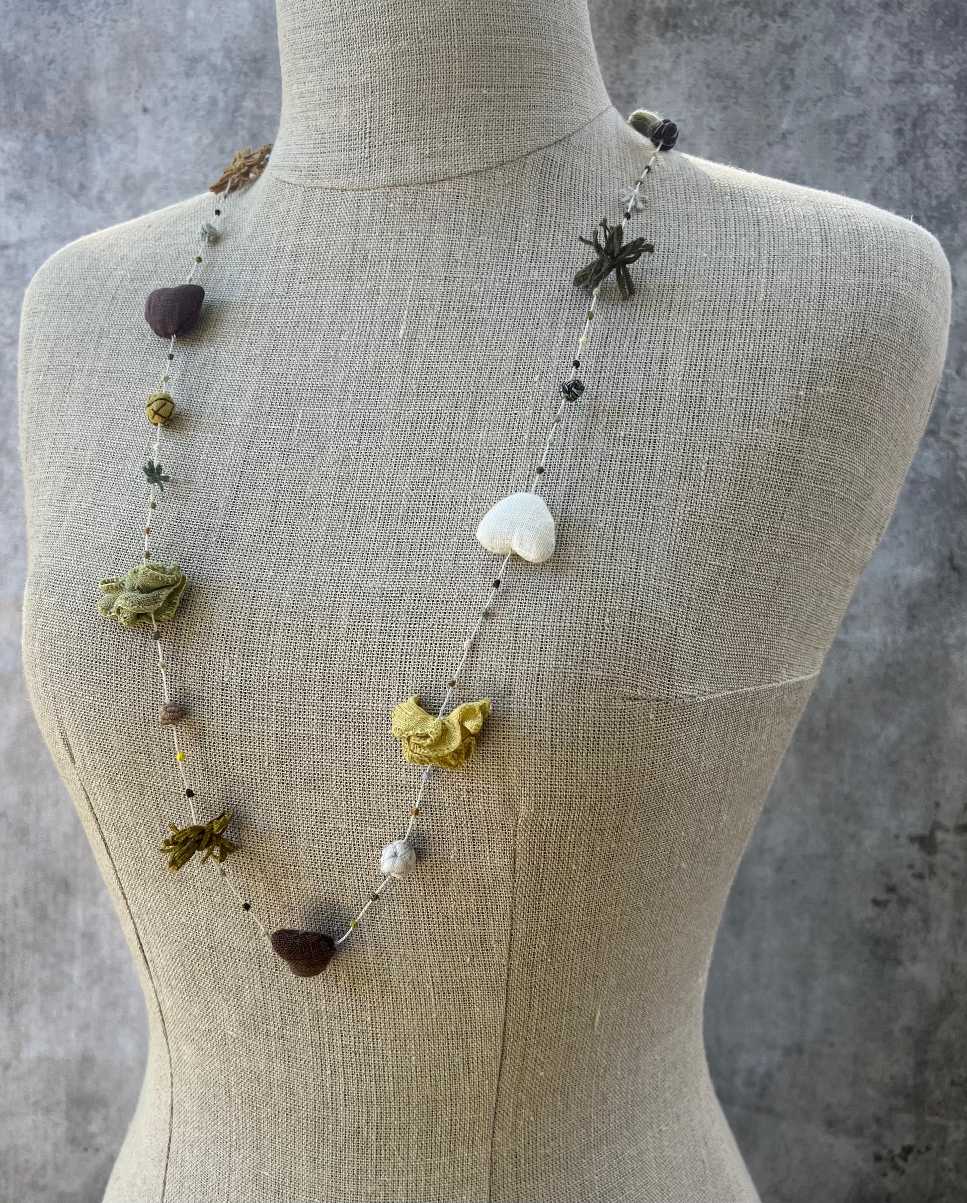 Hand-made,100% linen necklace; 11 inch diameter / 45cm diameter; Aureum palette: rich mauve, army green, mustard... It has linen hearts and sweet floral "charms.”