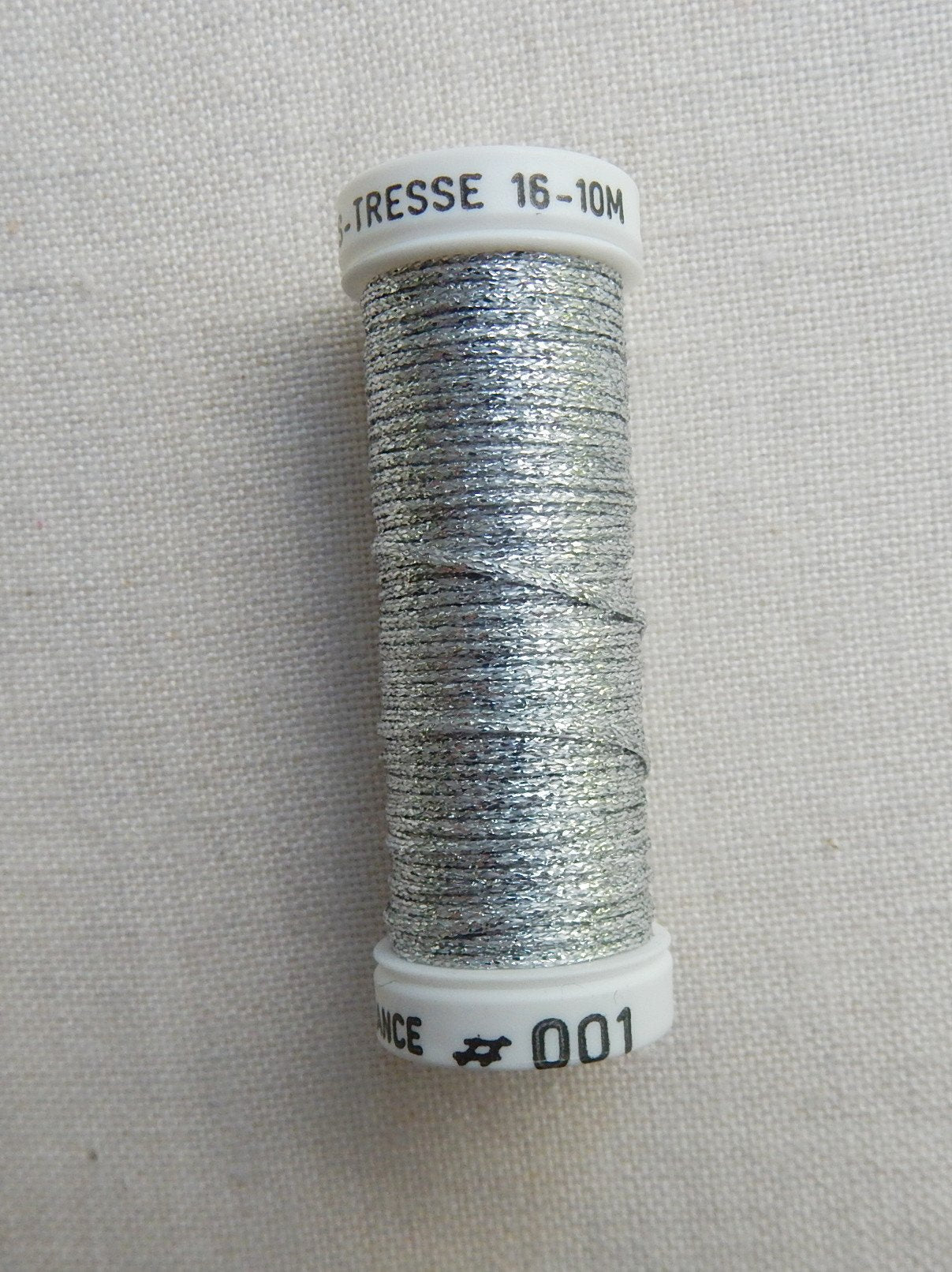 Metallic braided thread, roughly equivalent to 8 strands of DMC regular stranded cotton. 10 meters. Can be used alone or combined with other fibers in various decorative needlework.