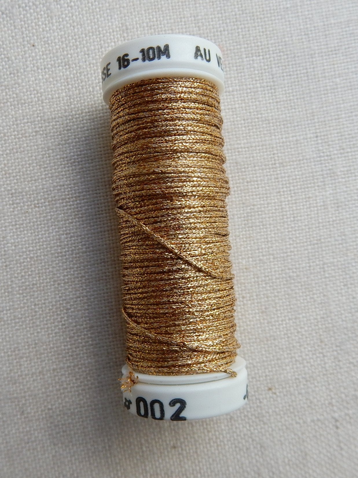 Metallic braided thread, roughly equivalent to 8 strands of DMC regular stranded cotton. 10 meters. Can be used alone or combined with other fibers in various decorative needlework.