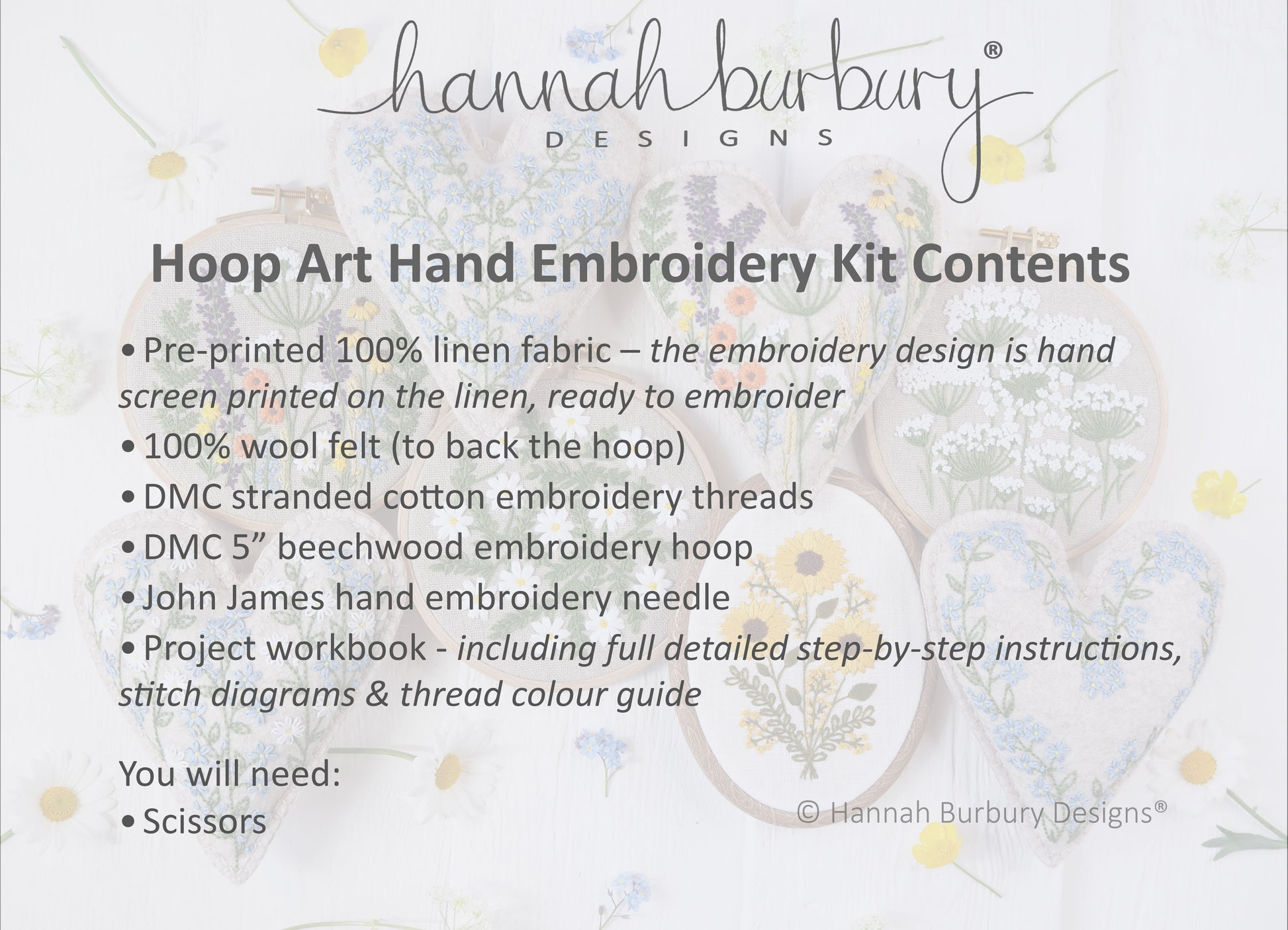 The kit includes a project workbook with a step-by-step photo guide in hand embroidering the design, a hand embroidery stitch guide and a thread colour and stitch guide. This is a suitable project for beginners and experienced stitchers.