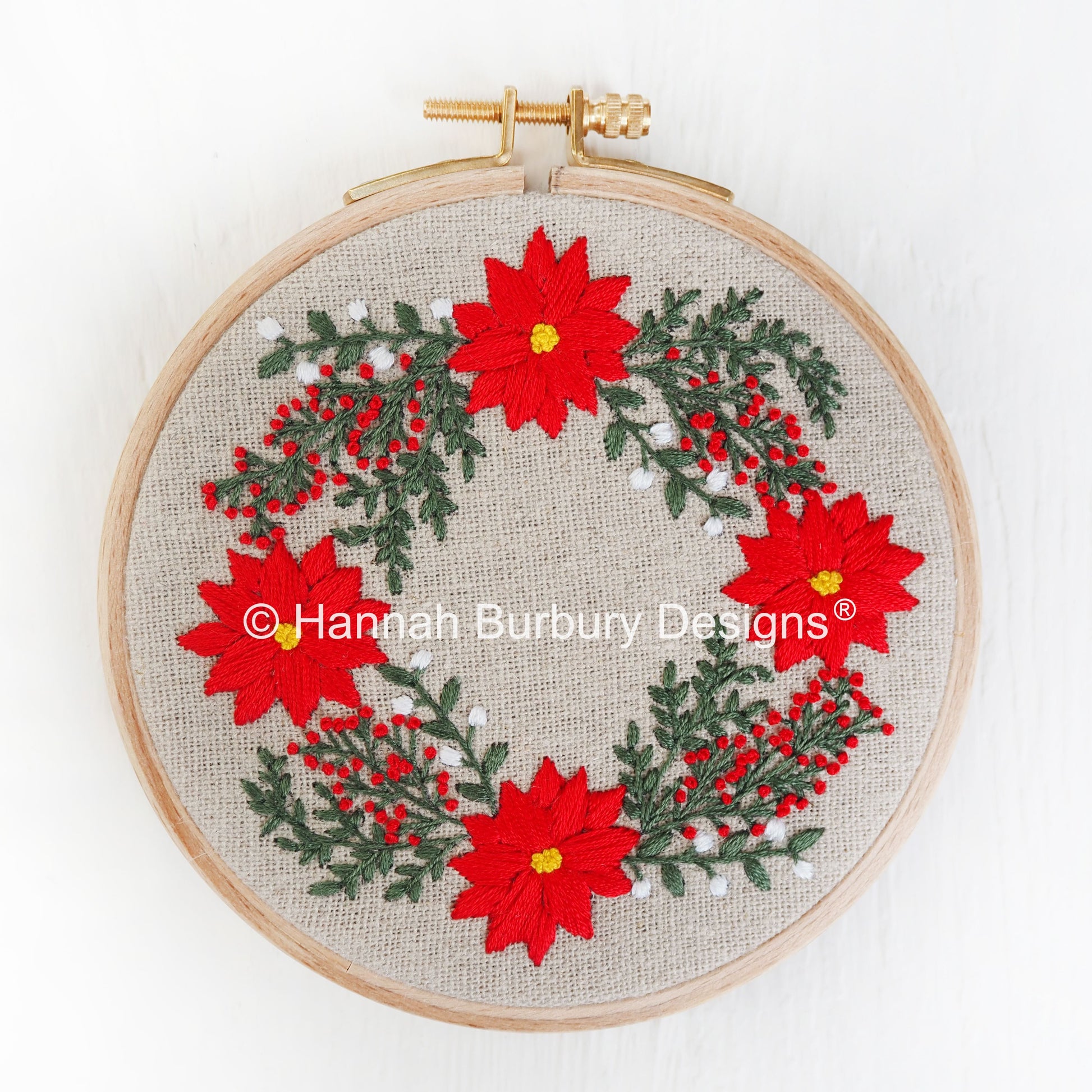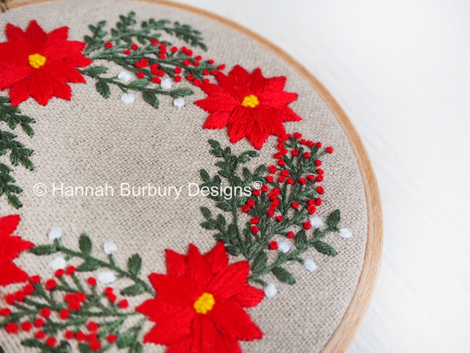 Make your own poinsettia hoop using this hand embroidery kit by Hannah Burbury Designs®. Made from high quality 100% linen and DMC cotton embroidery threads. The hoop will make a lovely decoration for your home or to give as a gift.