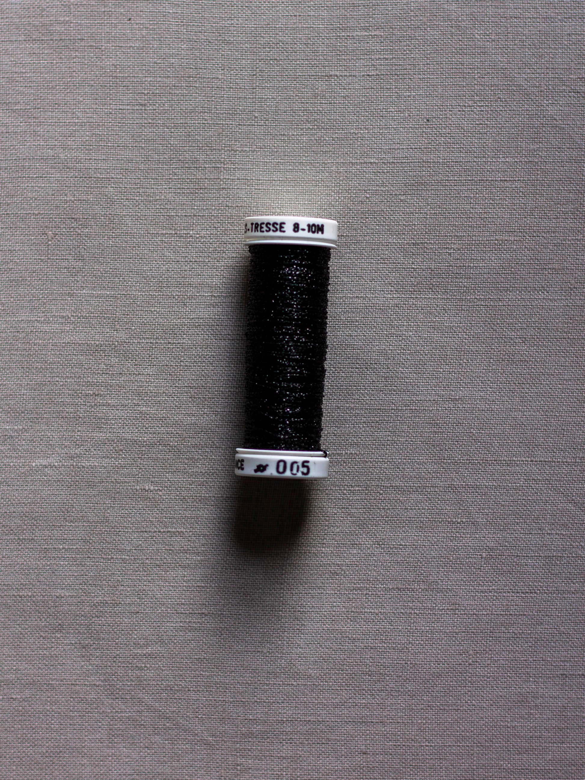 Au Ver à Soie metallic braid #8, may be used on its own or mixed with other fibers in a variety of techniques, approximately the size of two strands of regular six strand DMC. 10 meters per spool.
