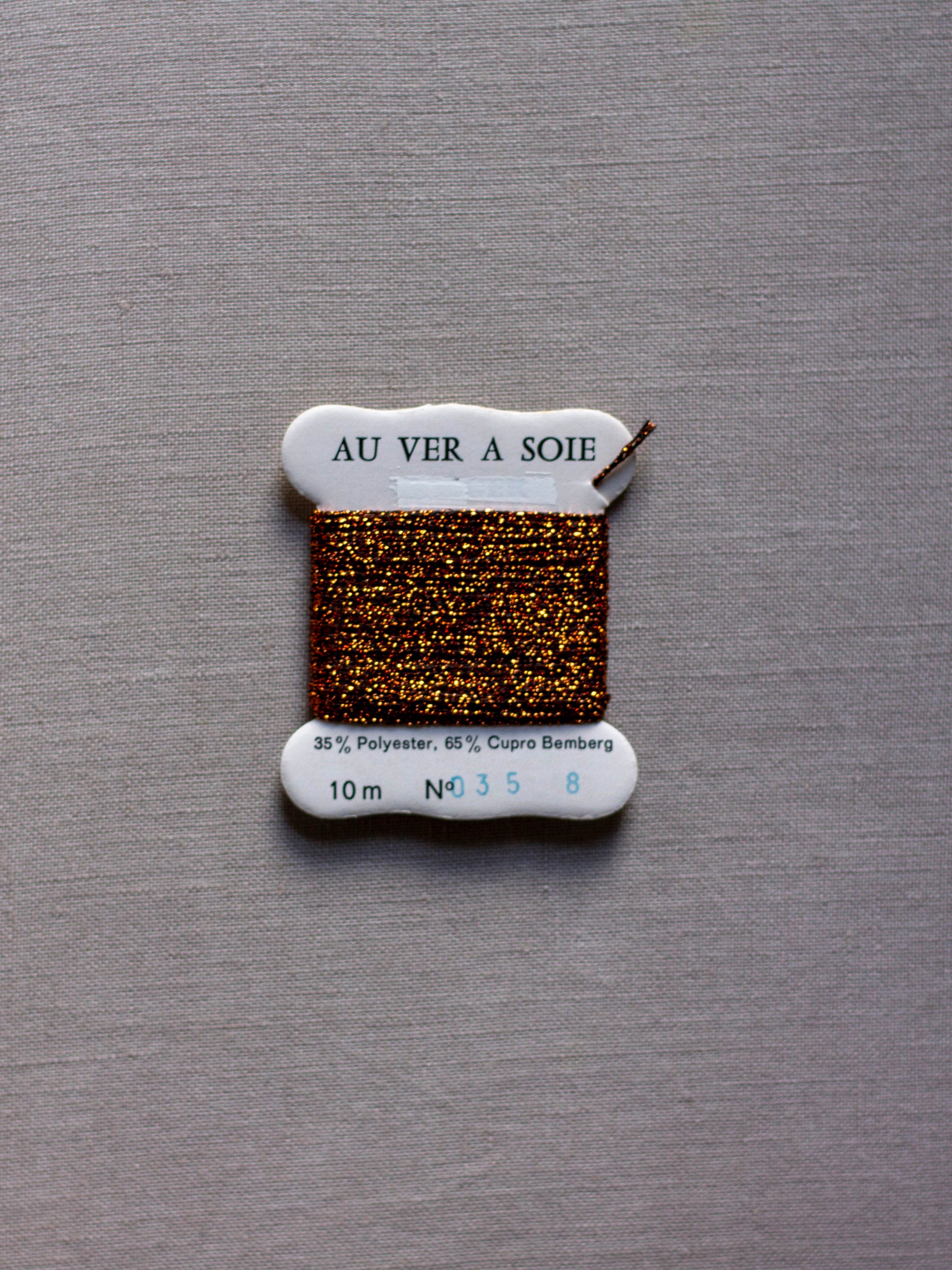 Au Ver à Soie metallic braid #8, may be used on its own or mixed with other fibers in a variety of techniques, approximately the size of two strands of regular six strand DMC. 10 meters per spool.