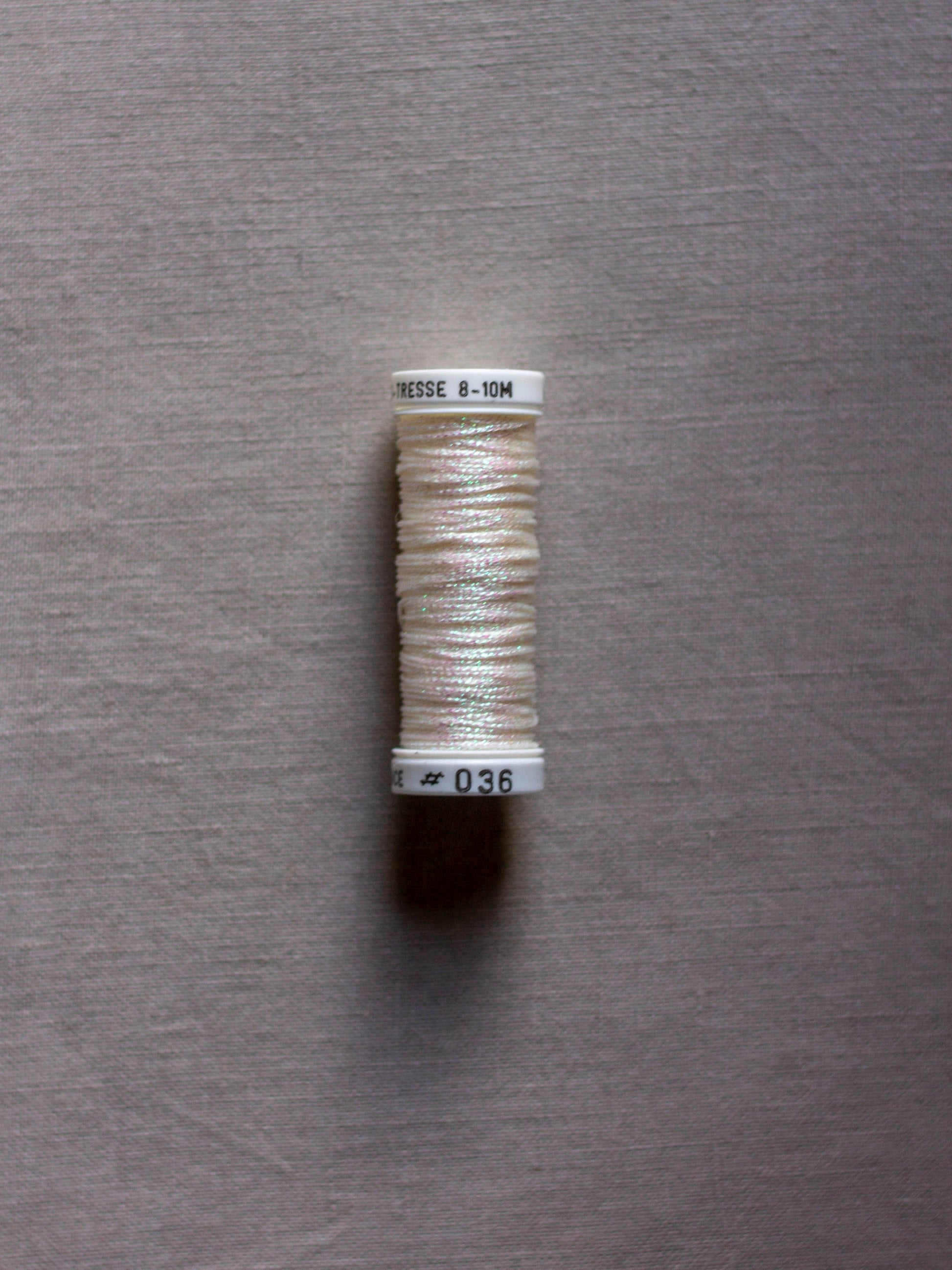 Au Ver à Soie metallic braid #8, may be used on its own or mixed with other fibers in a variety of techniques, approximately the size of two strands of regular six strand DMC. 10 meters per spool.