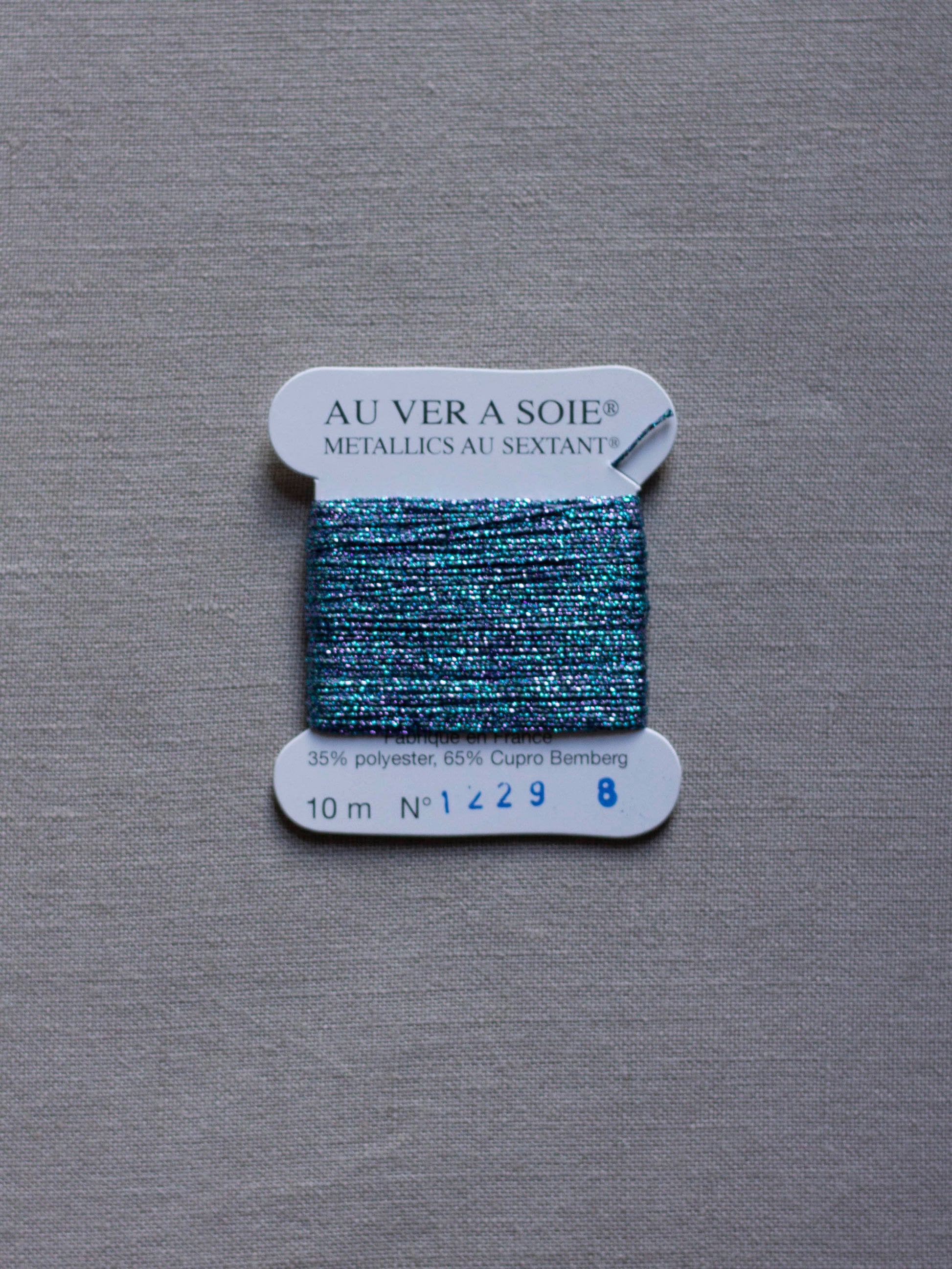 Au Ver à Soie metallic braid #8, may be used on its own or mixed with other fibers in a variety of techniques, approximately the size of two strands of regular six strand DMC. 10 meters per spool.