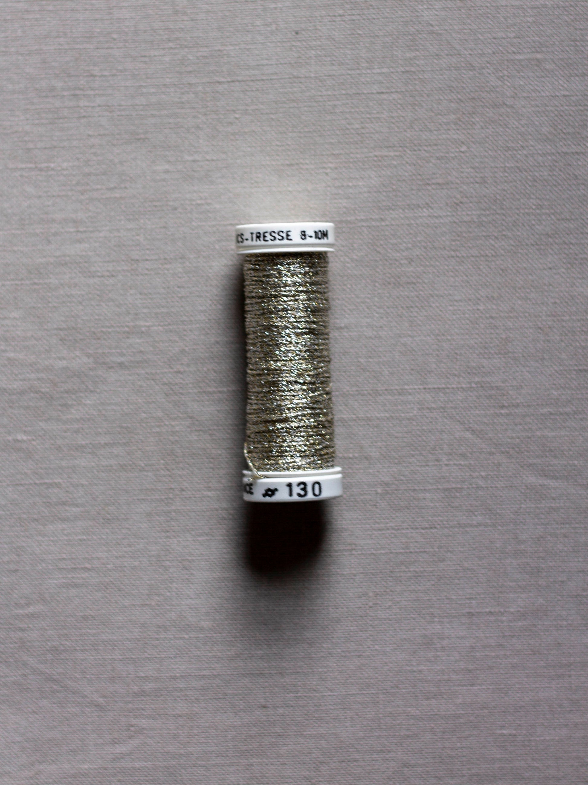 Au Ver à Soie metallic braid #8, may be used on its own or mixed with other fibers in a variety of techniques, approximately the size of two strands of regular six strand DMC. 10 meters per spool.