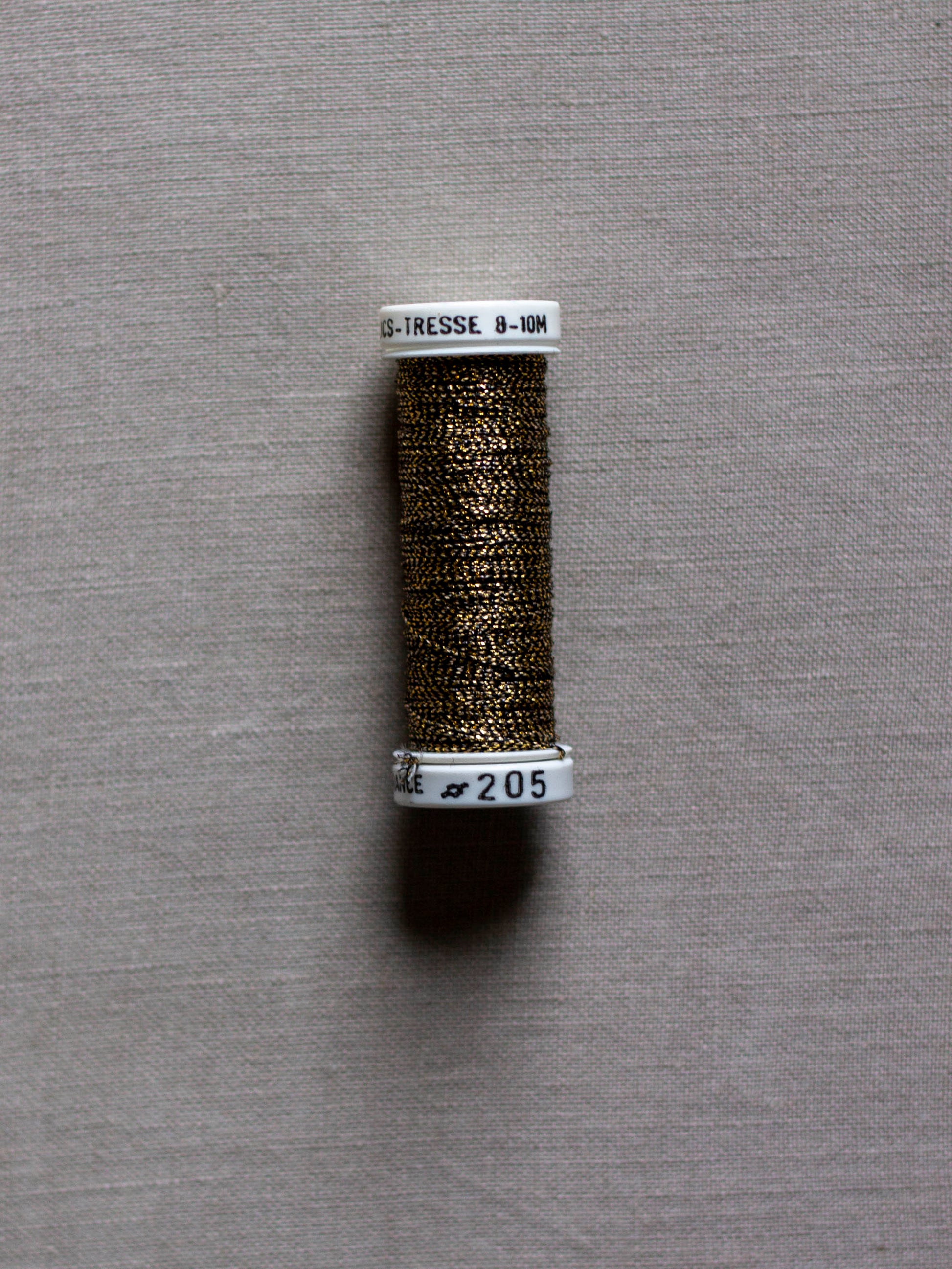 Au Ver à Soie metallic braid #8, may be used on its own or mixed with other fibers in a variety of techniques, approximately the size of two strands of regular six strand DMC. 10 meters per spool.