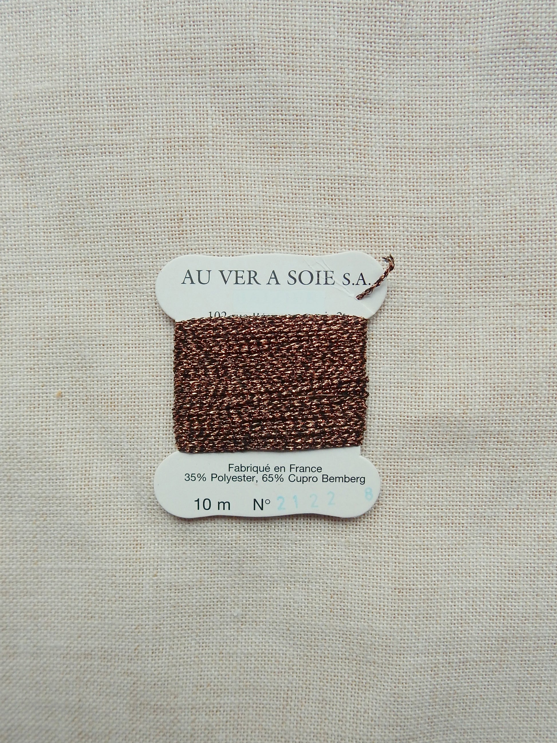 Au Ver à Soie metallic braid #8, may be used on its own or mixed with other fibers in a variety of techniques, approximately the size of two strands of regular six strand DMC. 10 meters per spool.