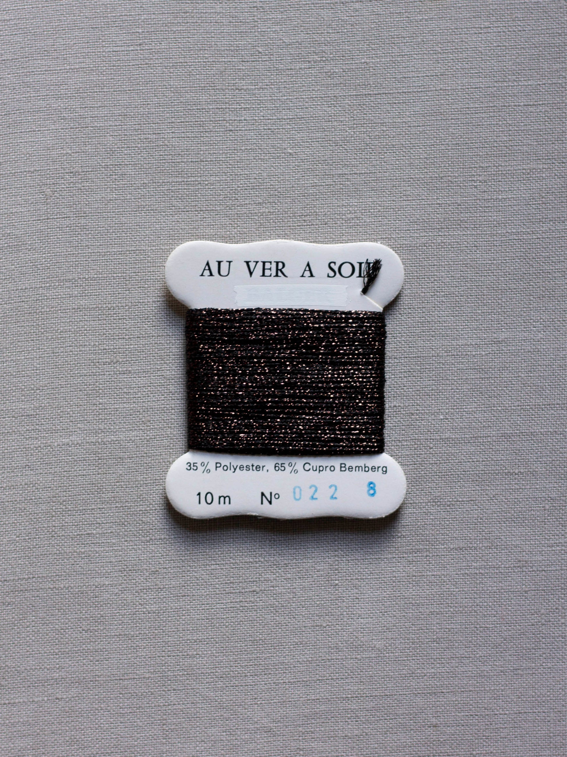 Au Ver à Soie metallic braid #8, may be used on its own or mixed with other fibers in a variety of techniques, approximately the size of two strands of regular six strand DMC. 10 meters per spool.