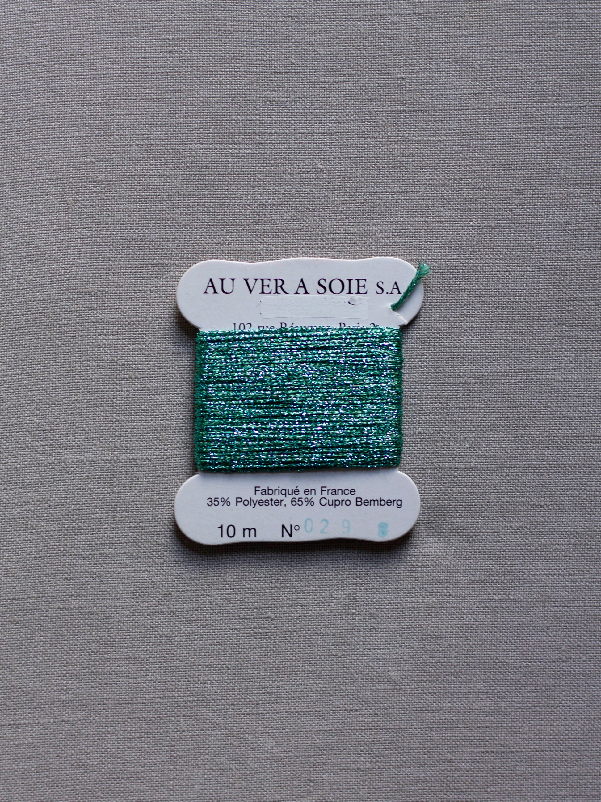 Au Ver à Soie metallic braid #8, may be used on its own or mixed with other fibers in a variety of techniques, approximately the size of two strands of regular six strand DMC. 10 meters per spool.