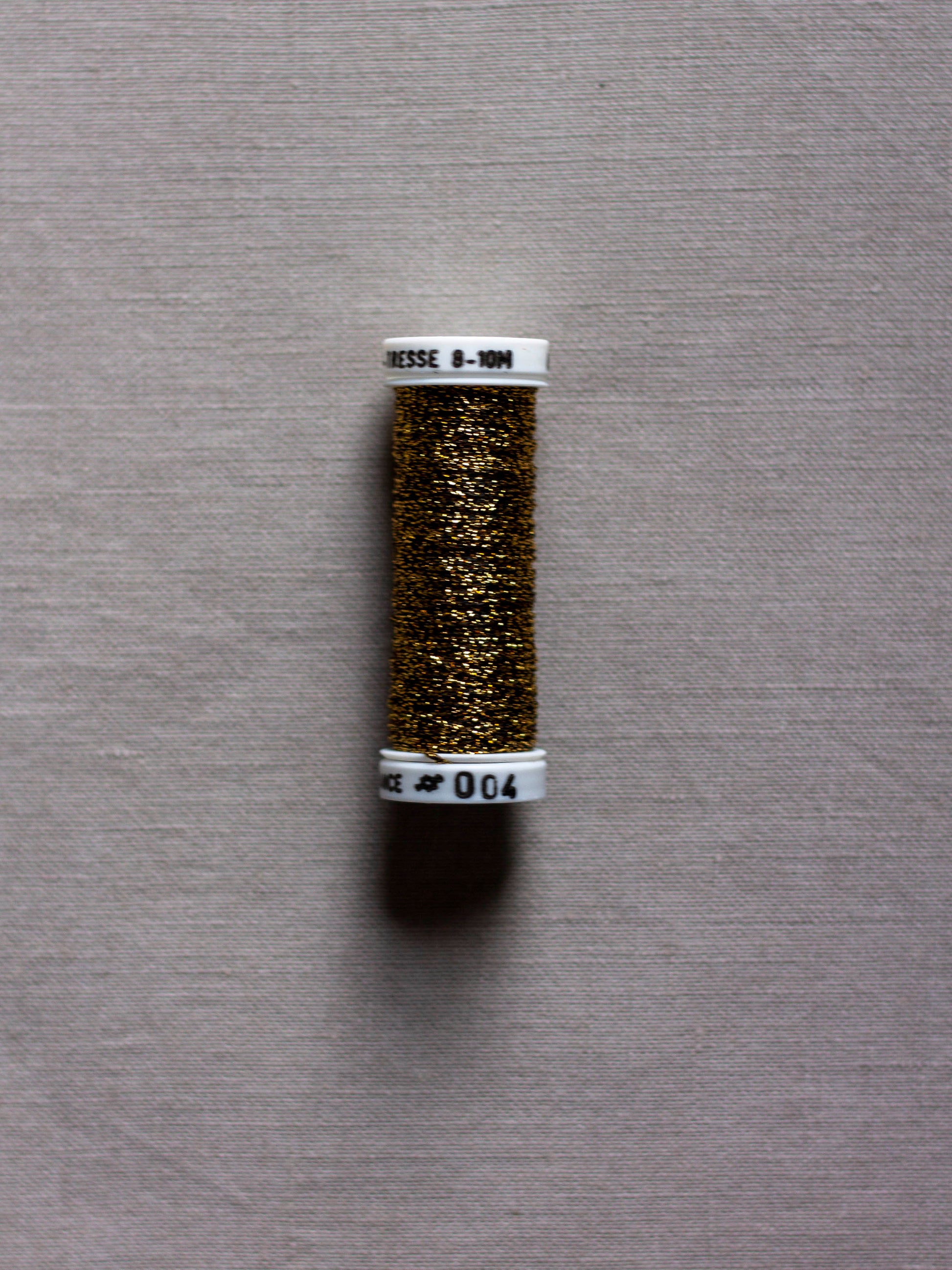 Au Ver à Soie metallic braid #8, may be used on its own or mixed with other fibers in a variety of techniques, approximately the size of two strands of regular six strand DMC. 10 meters per spool.