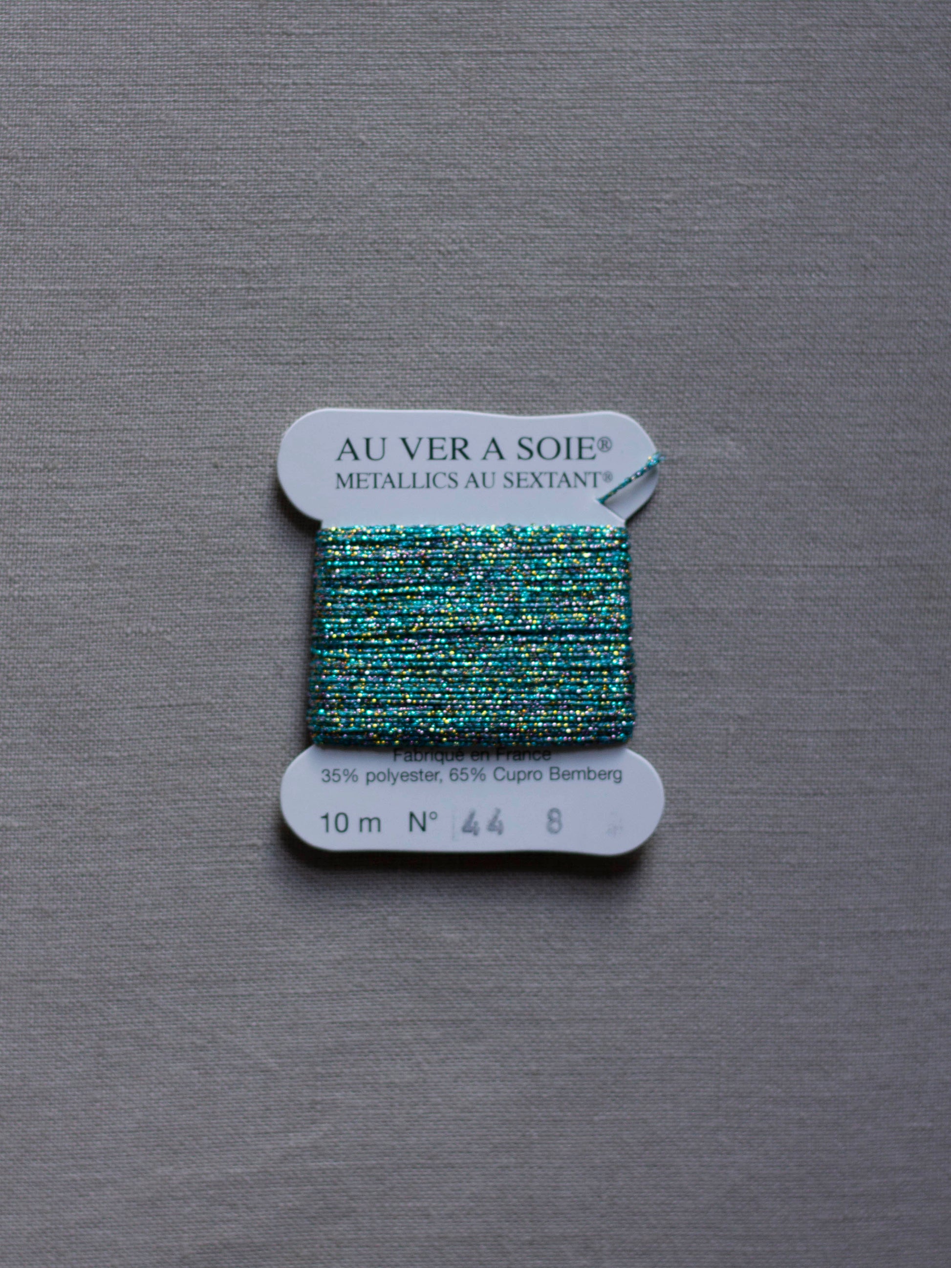 Au Ver à Soie metallic braid #8, may be used on its own or mixed with other fibers in a variety of techniques, approximately the size of two strands of regular six strand DMC. 10 meters per spool.