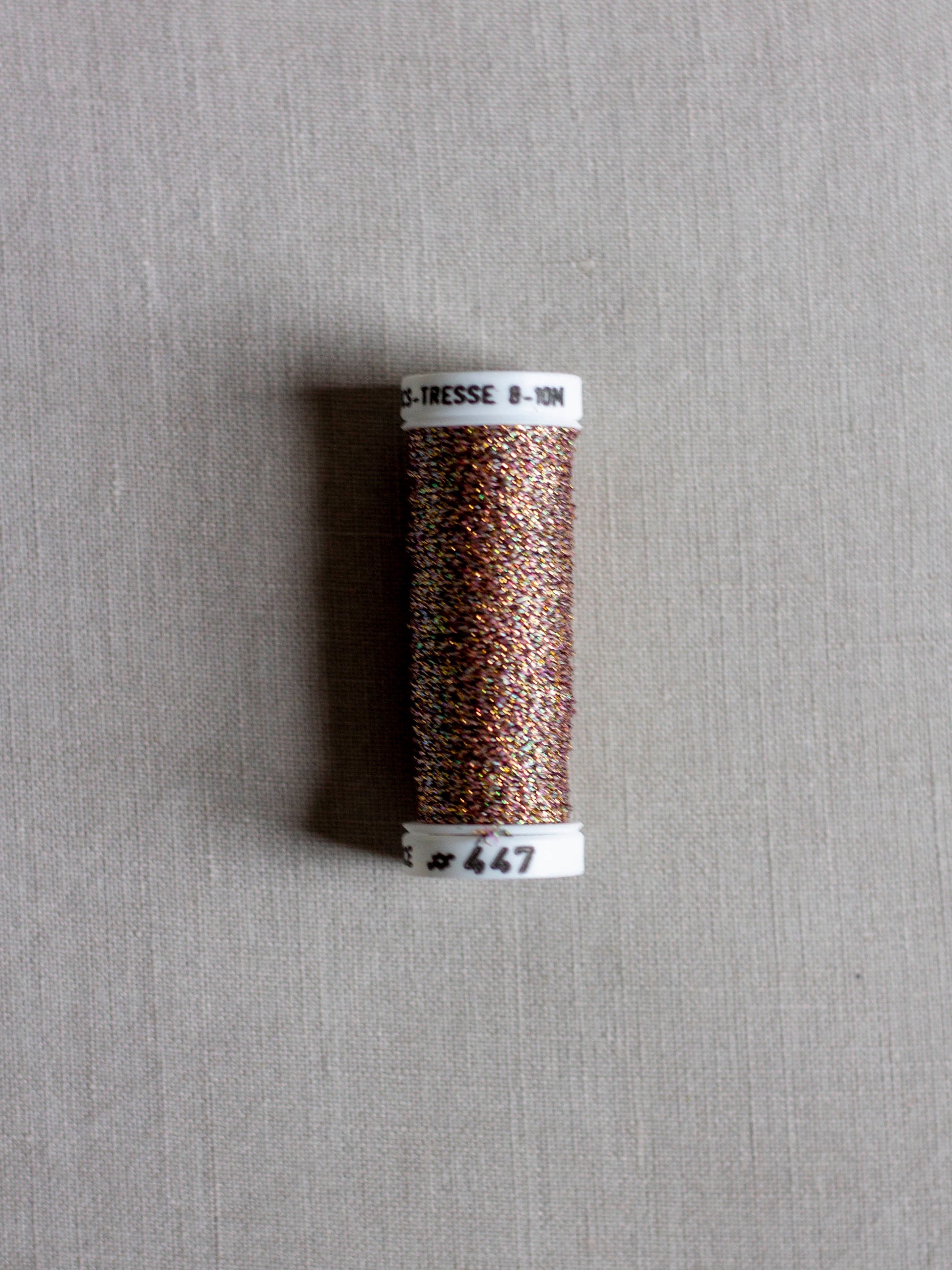 Au Ver à Soie metallic braid #8, may be used on its own or mixed with other fibers in a variety of techniques, approximately the size of two strands of regular six strand DMC. 10 meters per spool.