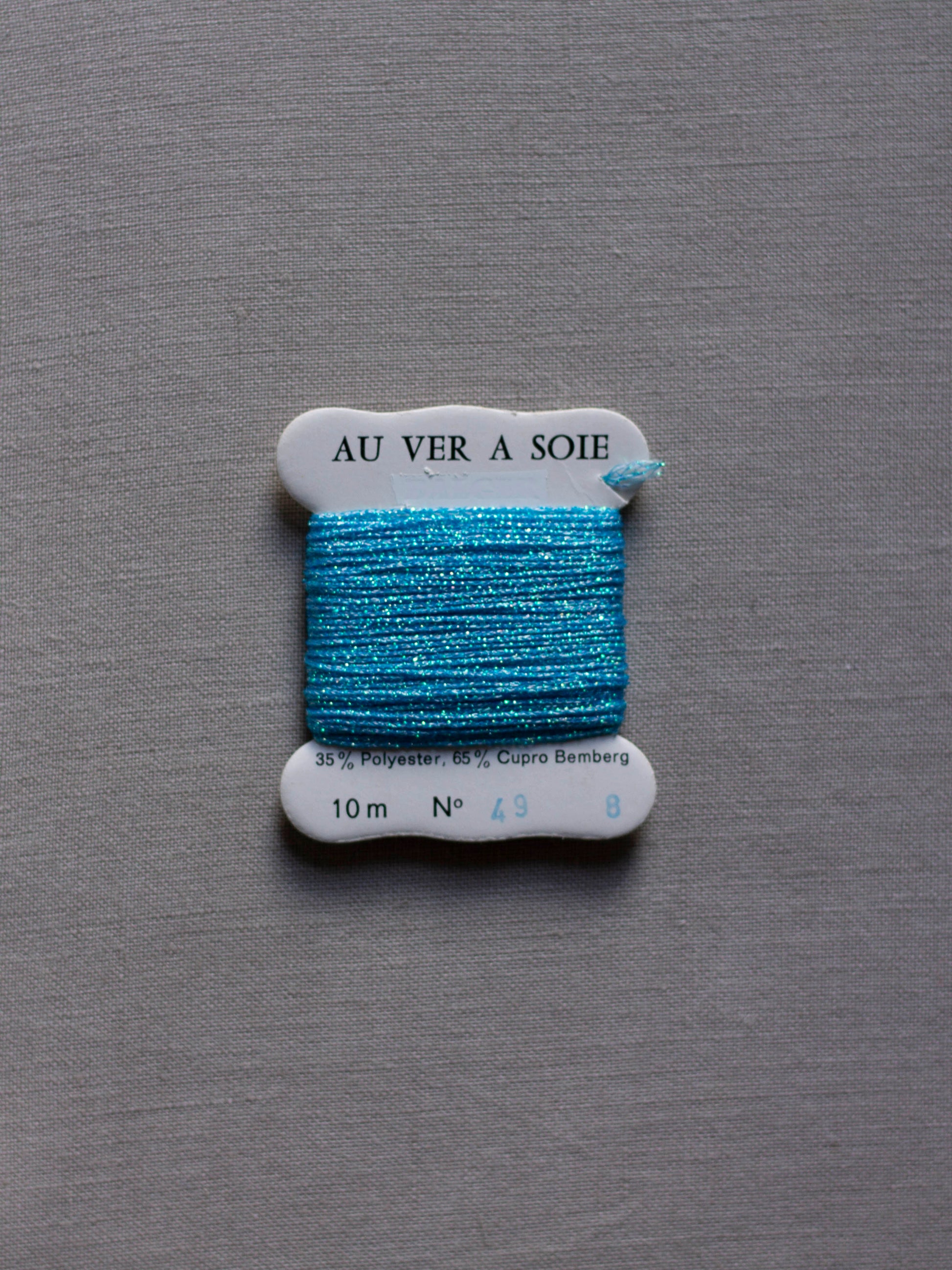 Au Ver à Soie metallic braid #8, may be used on its own or mixed with other fibers in a variety of techniques, approximately the size of two strands of regular six strand DMC. 10 meters per spool.