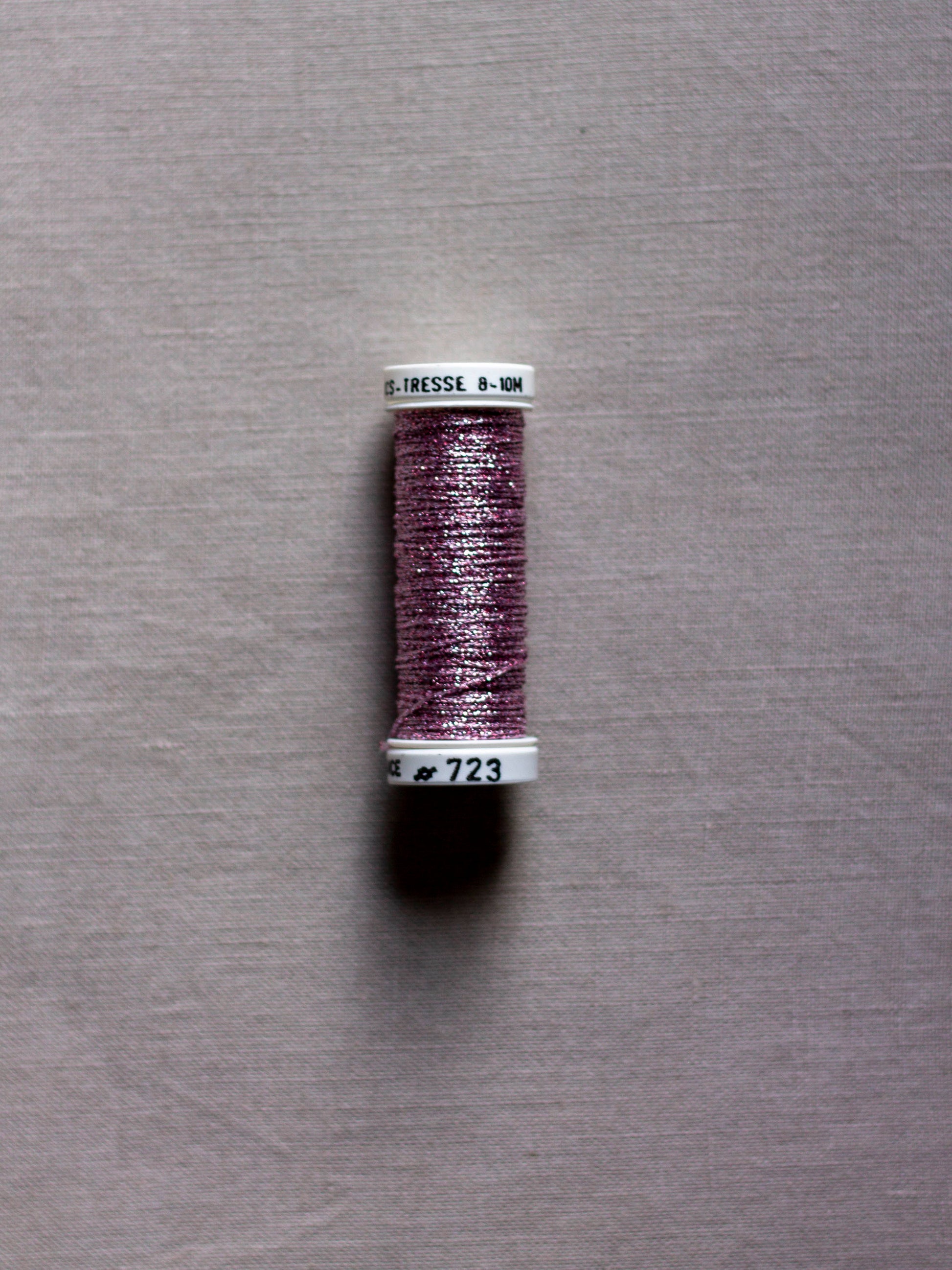Au Ver à Soie metallic braid #8, may be used on its own or mixed with other fibers in a variety of techniques, approximately the size of two strands of regular six strand DMC. 10 meters per spool.