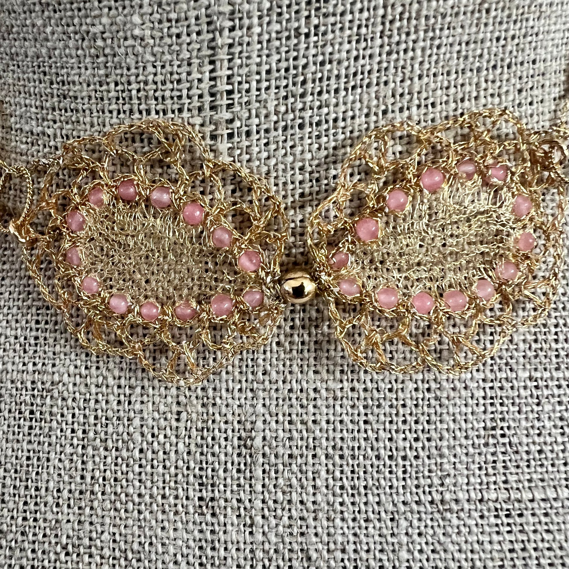 Ultra-fine, hand-crafted necklace from metallic thread, copper, gold plated brass chain, 14k gold filled beads and rings, agate stones; spring clasp and adjustable width.