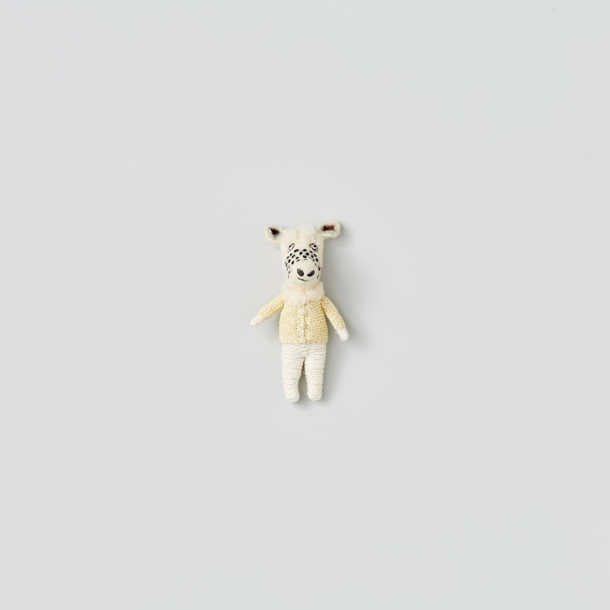 Prune is a sweet girl with soft eyes. She's wearing a butter-white, crocheted, button-up matched with white leggings and a "collar" of natural wool. Her snout is has a band of dark brown freckles that stand out against her ecrus appearance.