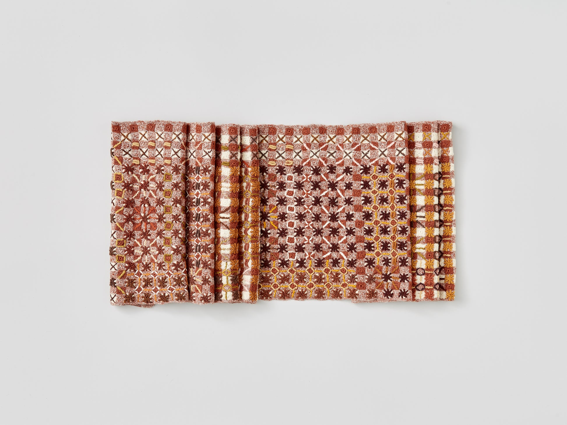Hand-made, 100% merino wool scarf; 48 inches long x 6 inches wide; checkers of ivory and tomato reds with details of blush pink, sea-green, orange, dark brown.