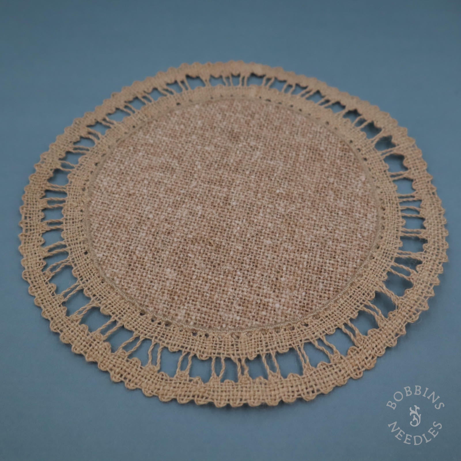 20th century, rustic linen placemat trimmed with hand-made lace; ideal for cross-stitch; set includes 4 pieces; approximately 20cm / 8 inch diameter