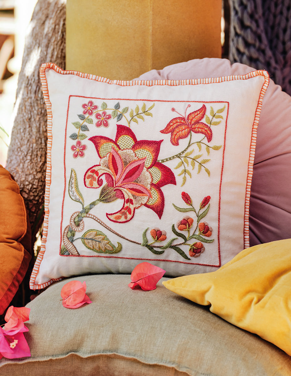 Fabulous crewel cushion with striking colours and expertly combined stitches.