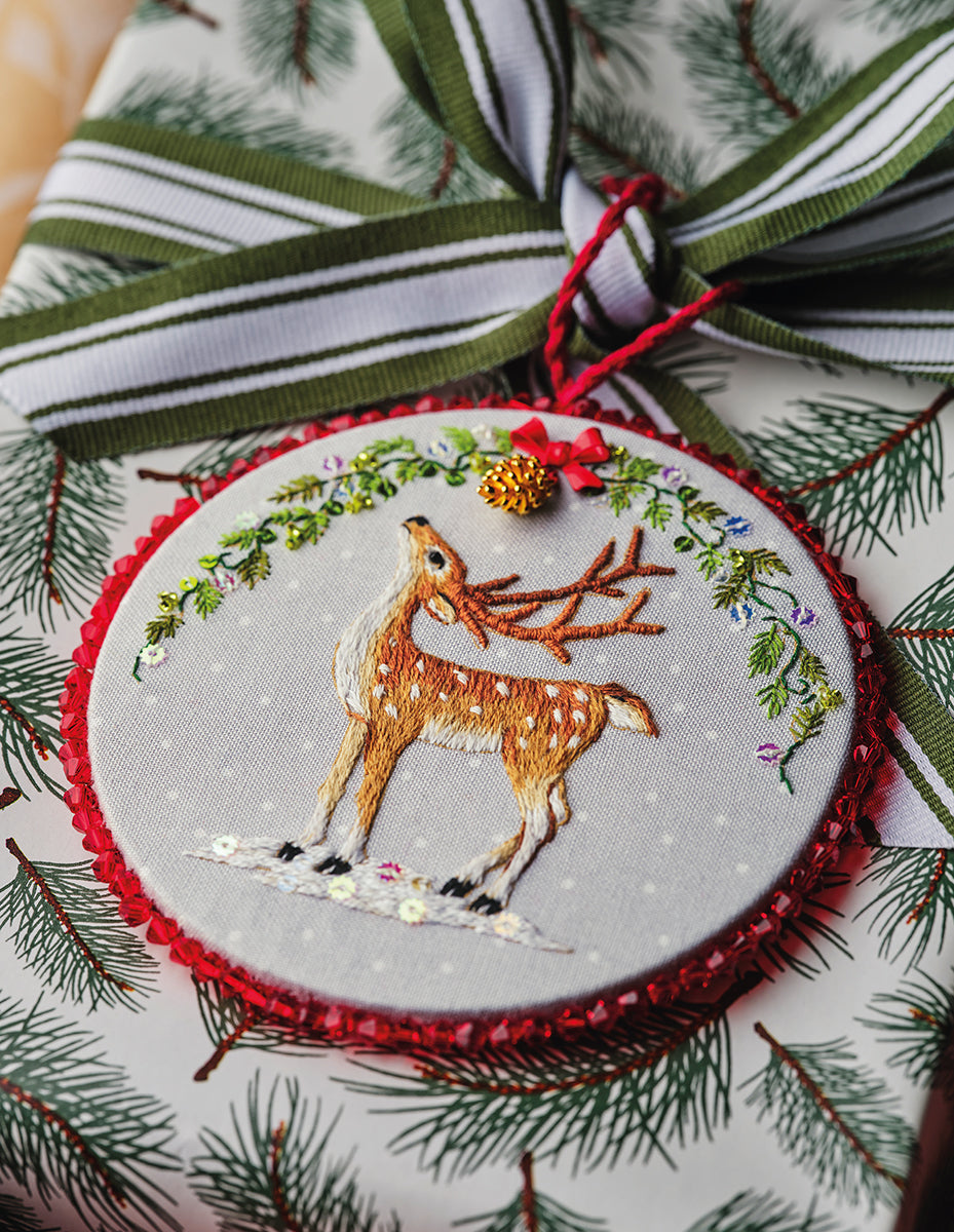 Threadpainted Christmas ornament featuring an enchanting deer beneath a festive garland.