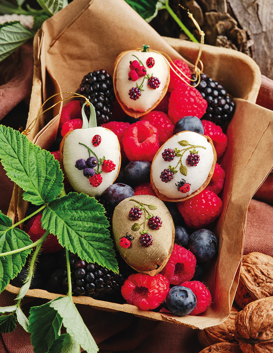 Delightful walnut shell pincushions with sprigs of beaded berries and a stumpwork or glass ladybird.