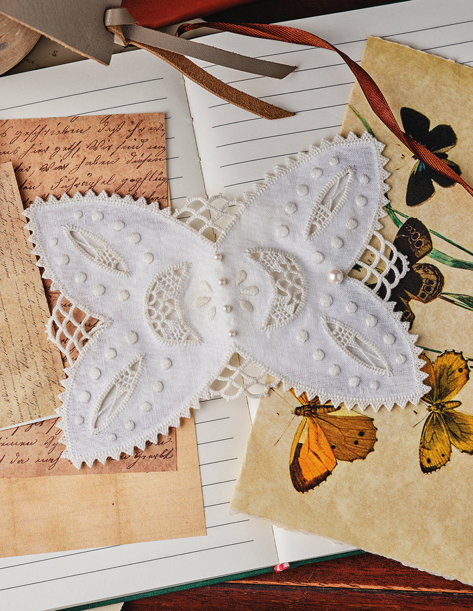 Pretty butterfly needlebook worked with Hedebo embroidery.