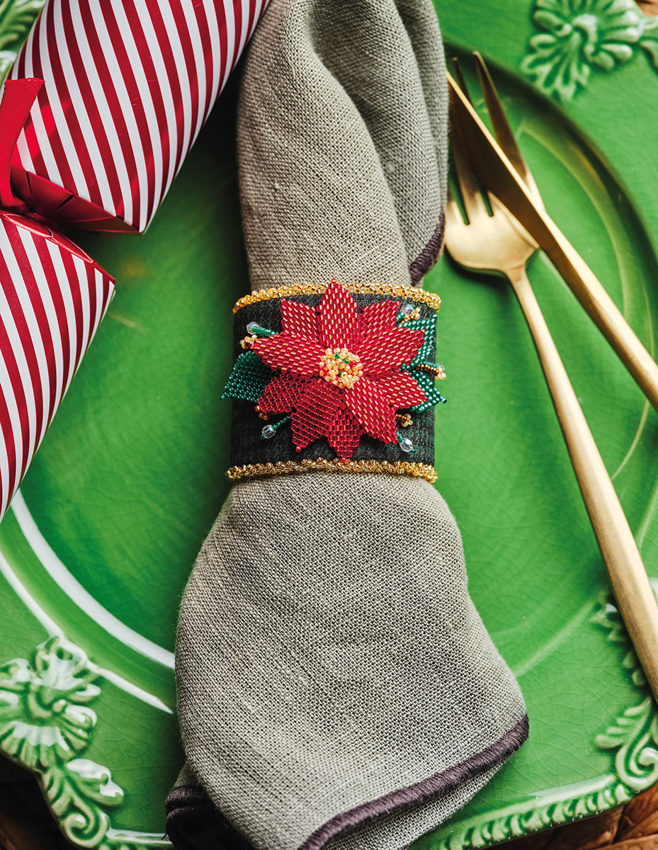 A highly decorative serviette ring showcasing a red poinsettia in sparkling, three-dimensional beading.