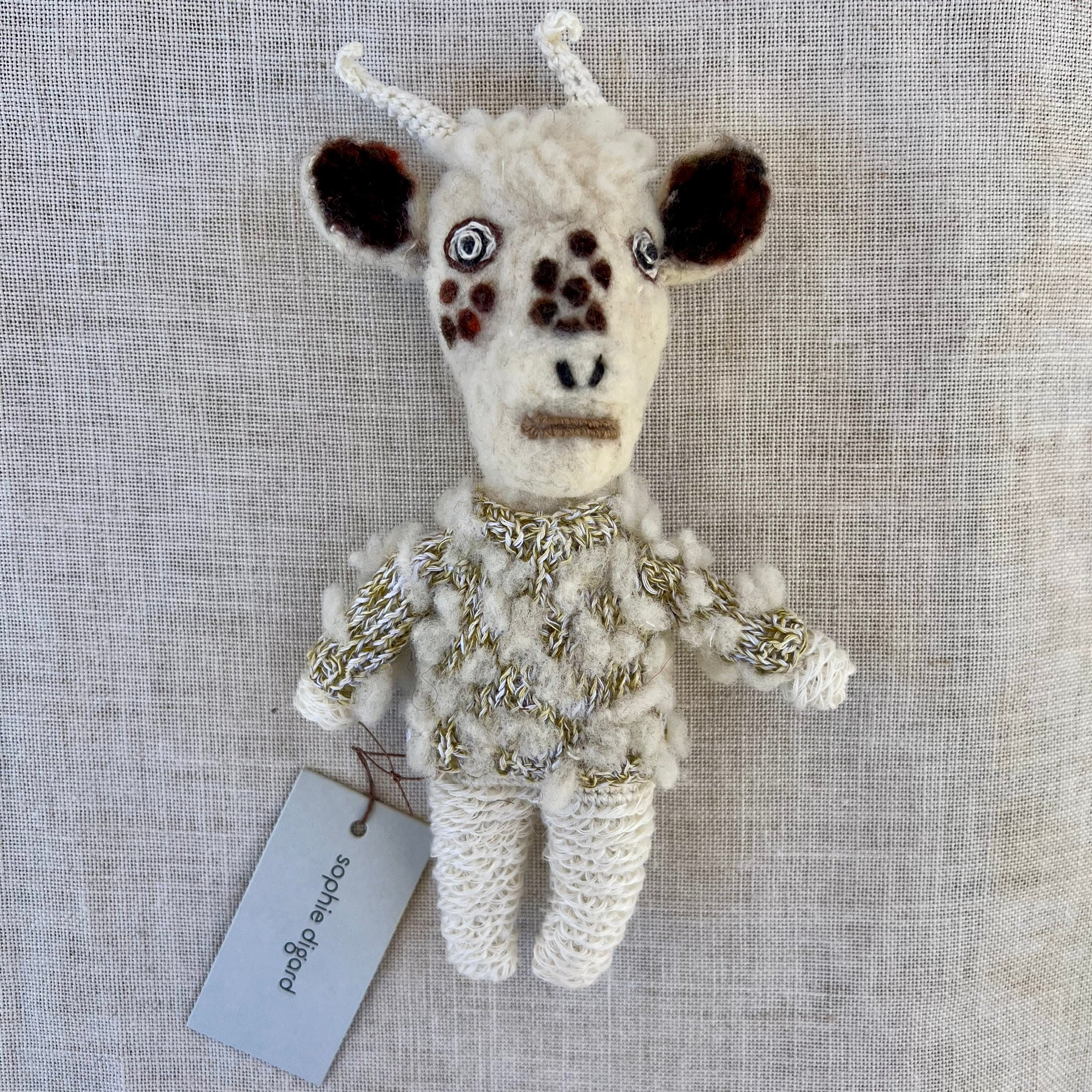 Virgil's eyes are wide open, slightly fearful... His orangey-brown freckles and ears are the only contrast to his white-as-snow appearance. He's sporting a pullover with clumps of wool matched with white leggings. His horns are daintily crocheted.