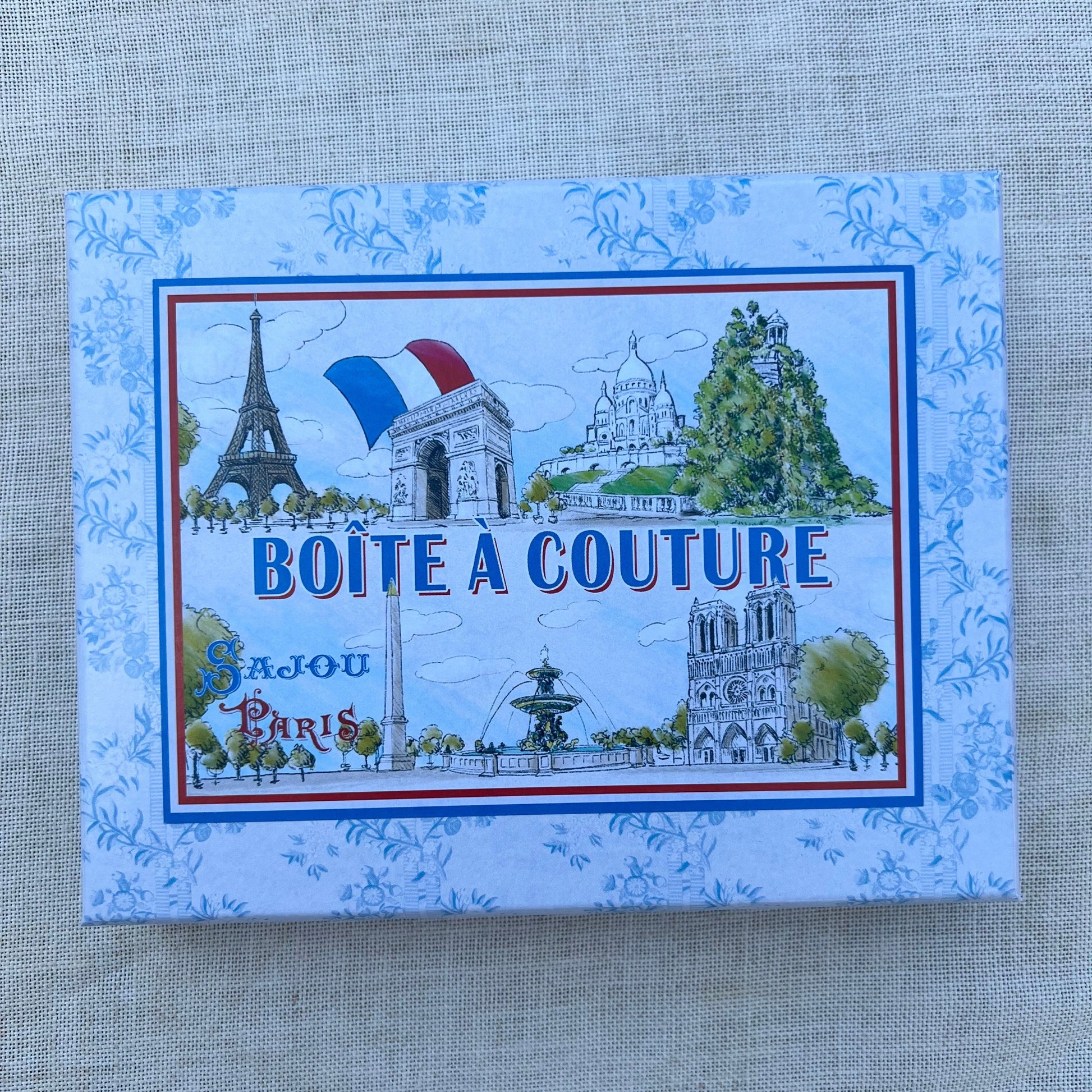 The box consists of two trays, the top one with two small Sajou ribbons can be removed. It is covered with one of our white and blue papers. Motifs can vary. The lid has a label with an imaginary watercolour panoramic view of Paris on the outside and the Articles de Paris label inside.