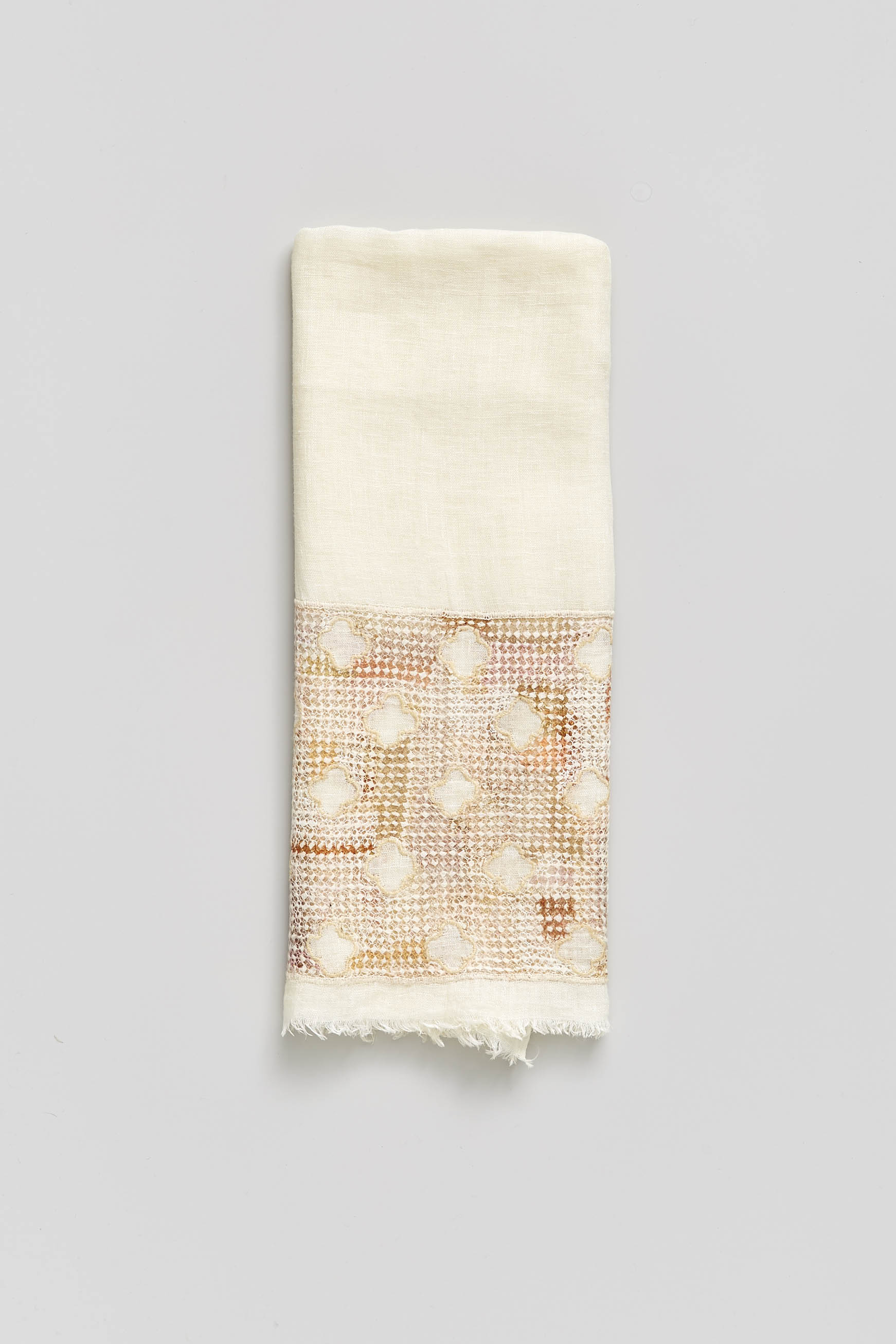 14 x 54 linen voile open work piece. The background is a pale buttery ivory. Amazing needlecraft pattern.