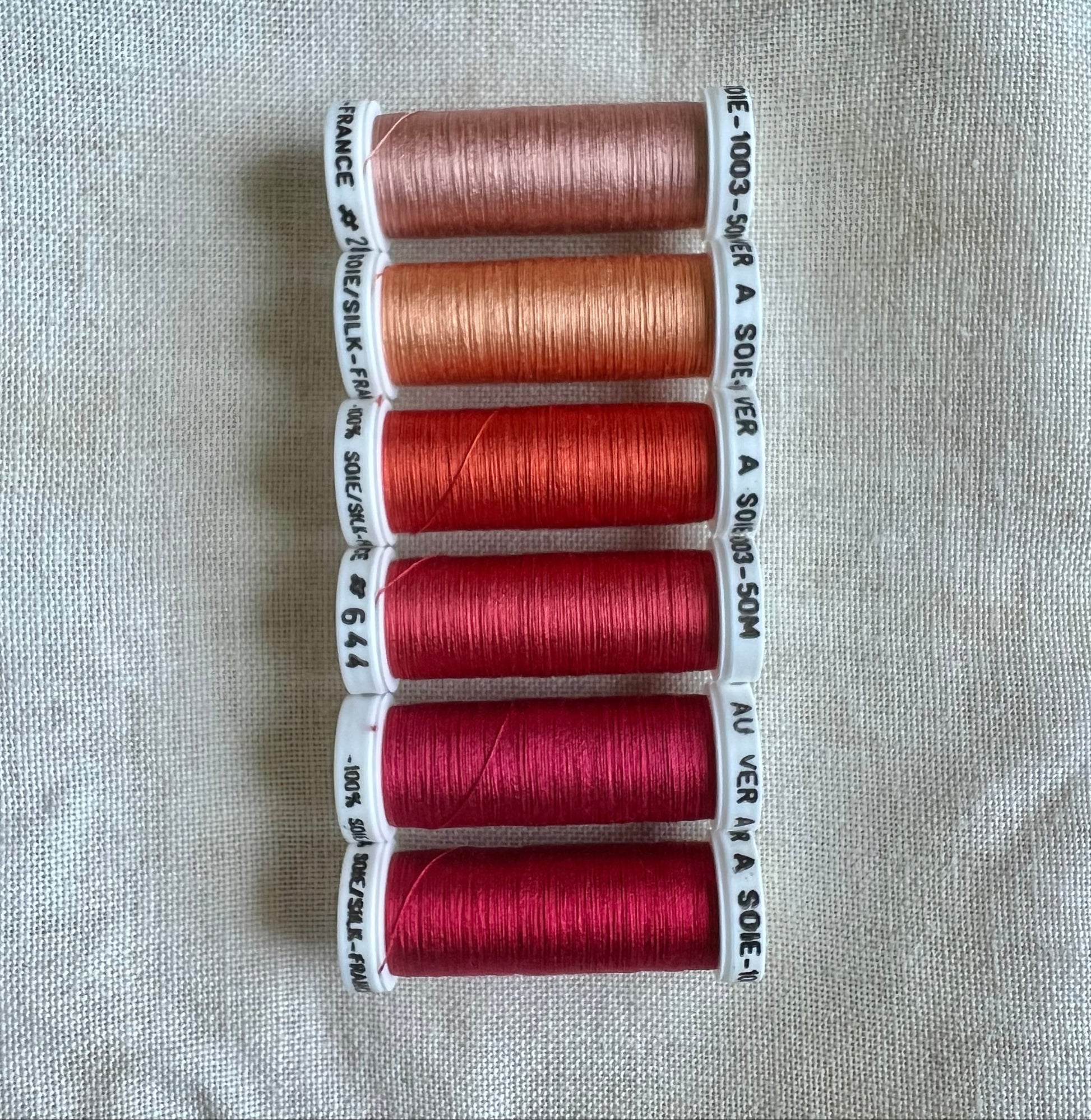 Au Ver À Soie® Soie 100/3, is a three ply highly twisted spun silk. Made in France. Uses include for embroidery, counted thread, canvas work, fine sewing, machine and long-arm quilting. The thread thickness is slightly finer than a single ply of Soie d’Alger.