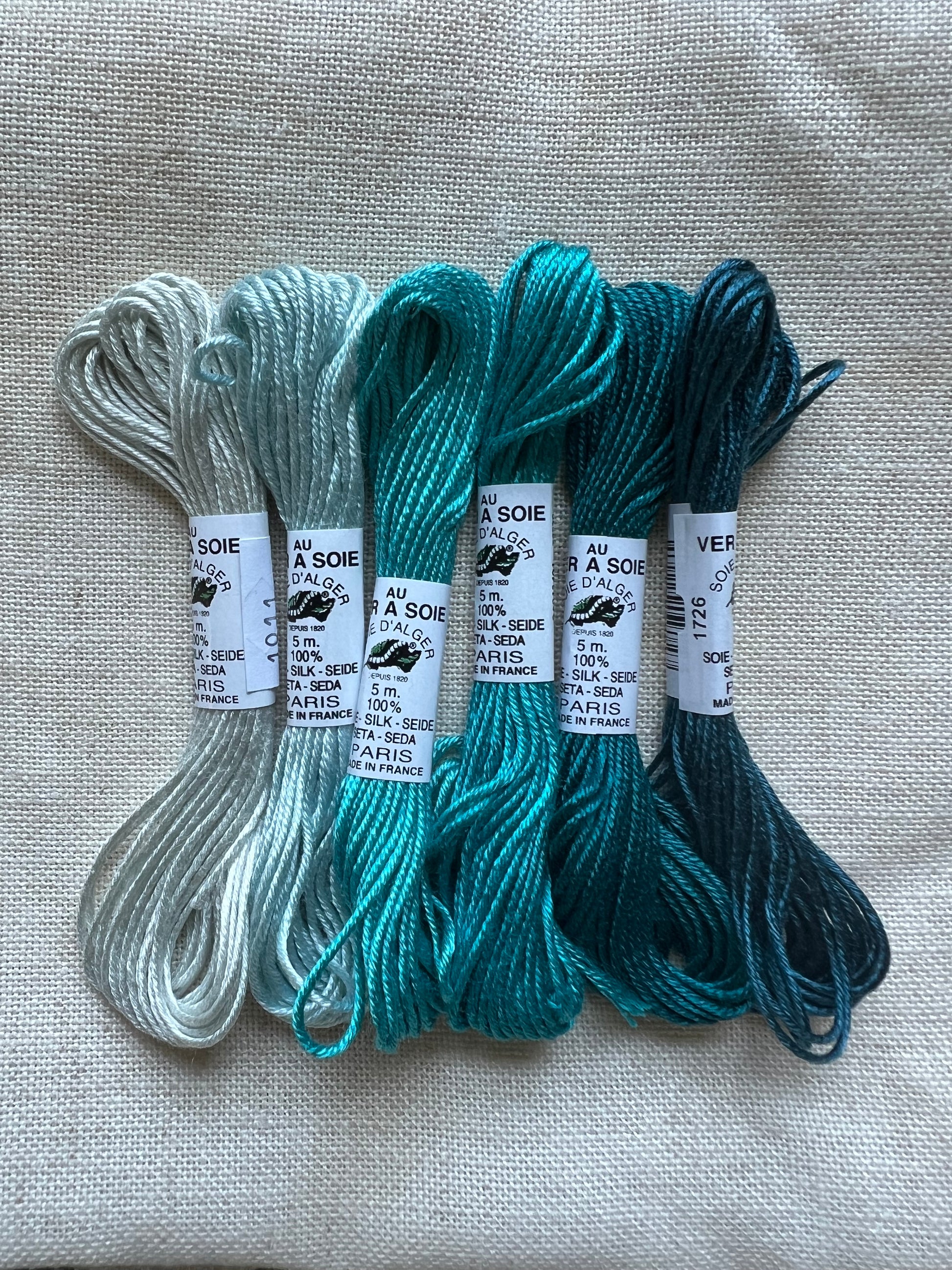 6 colors, 5 meters each, 7 strand semi lustre, easily separated strands of spun silk. It is not made in Algers, that refers to an in house process to fabricate the thread.