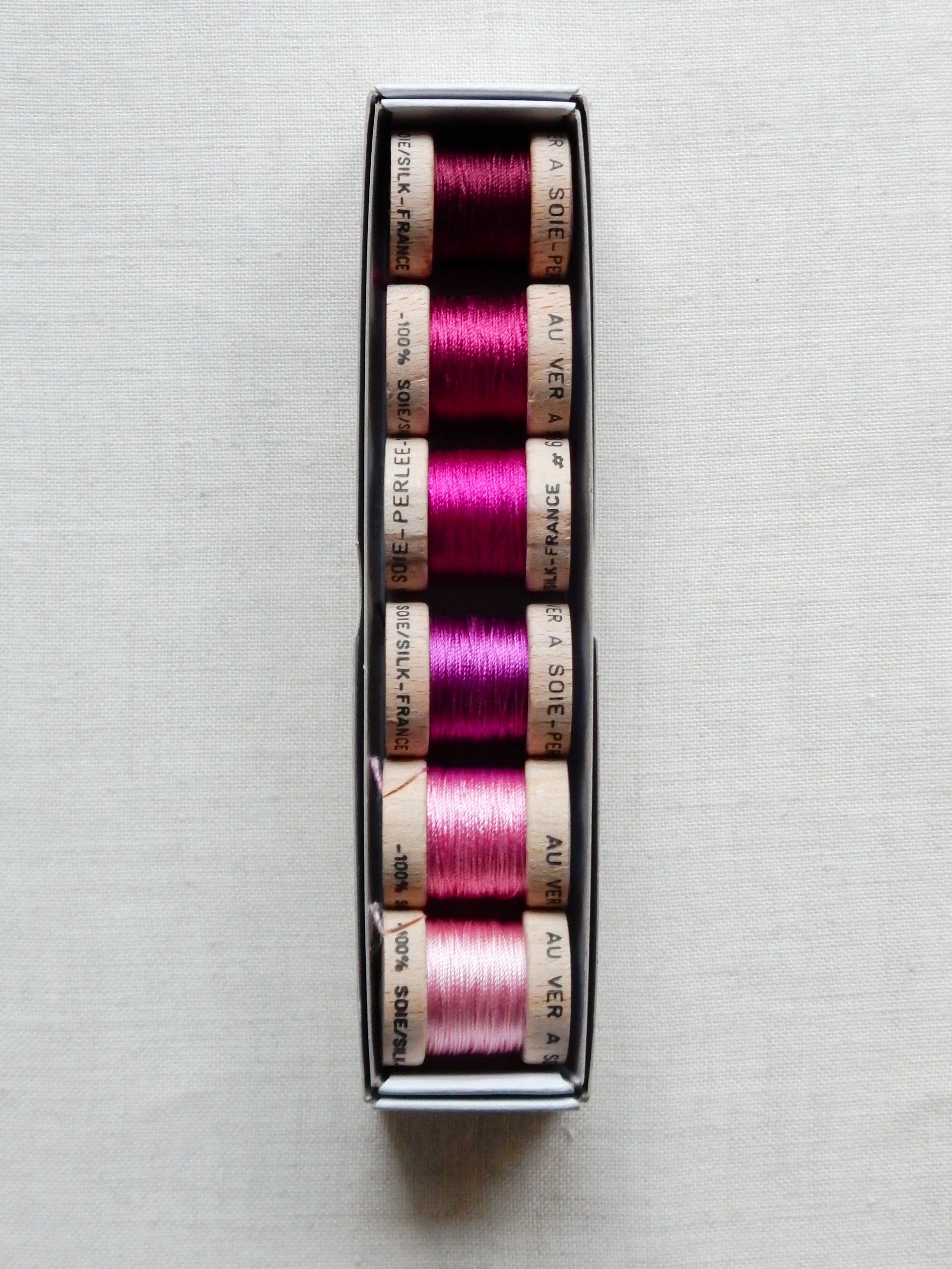 6 shades of pinks. 3 ply twisted filament silk that is smooth, soft and lustrous, made of raw silk. Good tensile strength and resists well to abrasion. For embroidery and miniature crochet.