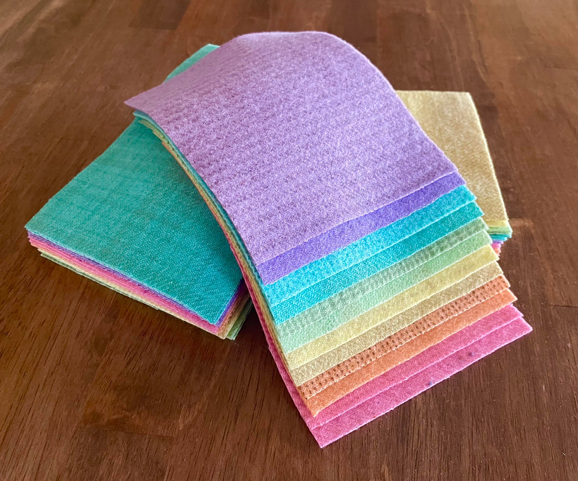 Spring: This is an appliqué bundle of felted wool pieces, composed of lots of clear pastel colors and a variety of textures, perfect for appliqué artists and crafters. You will receive two pieces each of pink, lavender, blue, spring green, peach, and soft yellow. These are generously sized pieces, measuring 5"x7" each. This is a great way to collect a bunch of exciting colors without making a big investment.