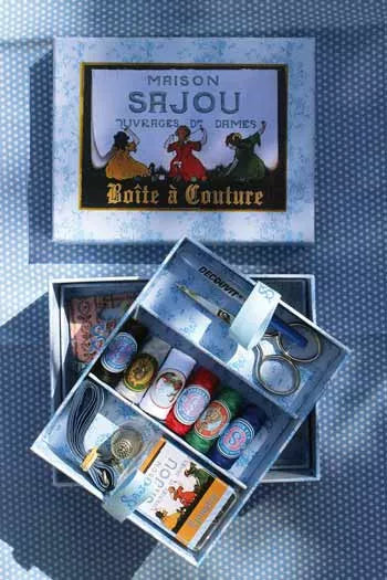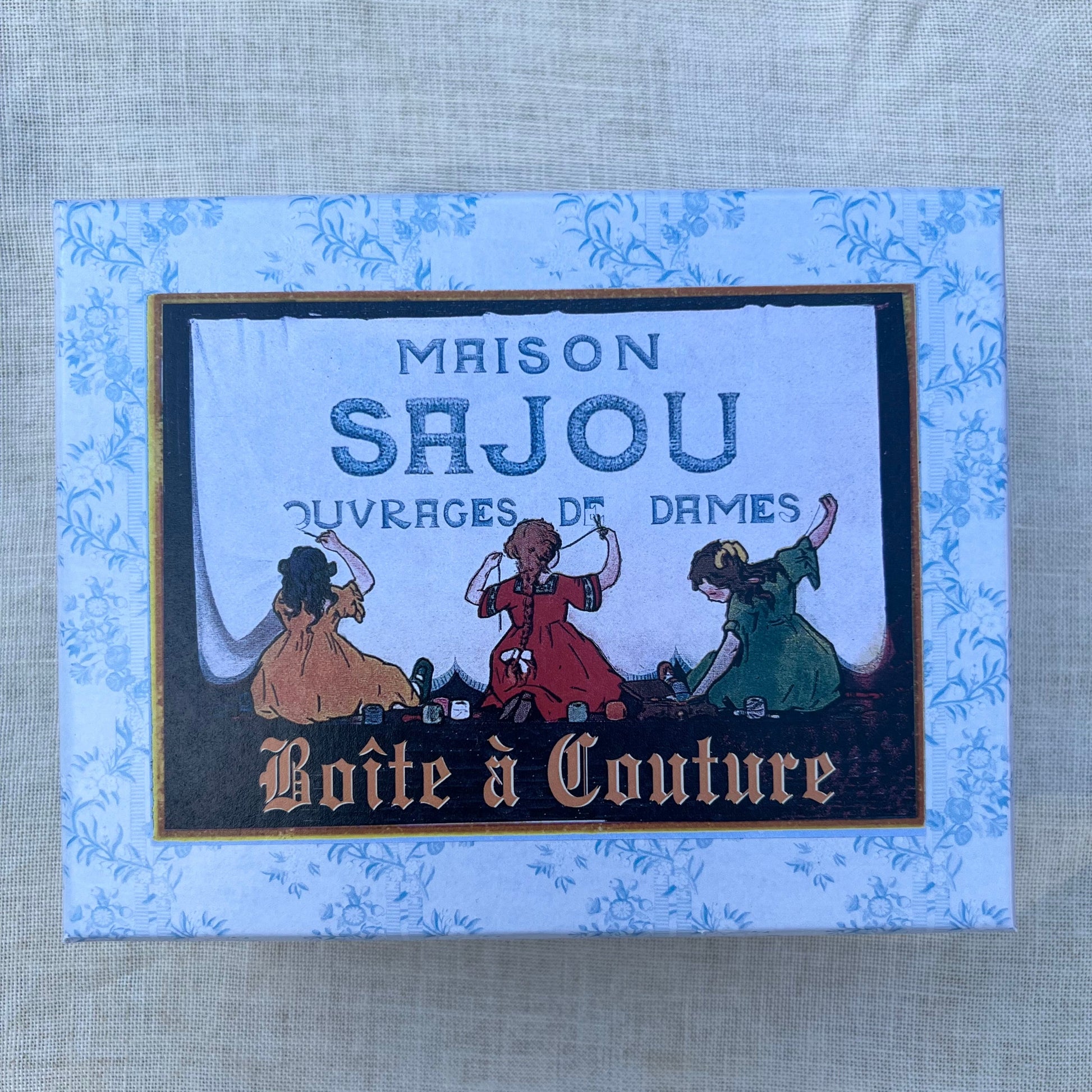 The box consists of two trays, the top one with two small Sajou ribbons can be removed. It is covered with one of our white and blue papers. Motifs can vary. The lid has a label with the three Sajou girls embroidering on the outside and the Fil Au Conscrit label inside.