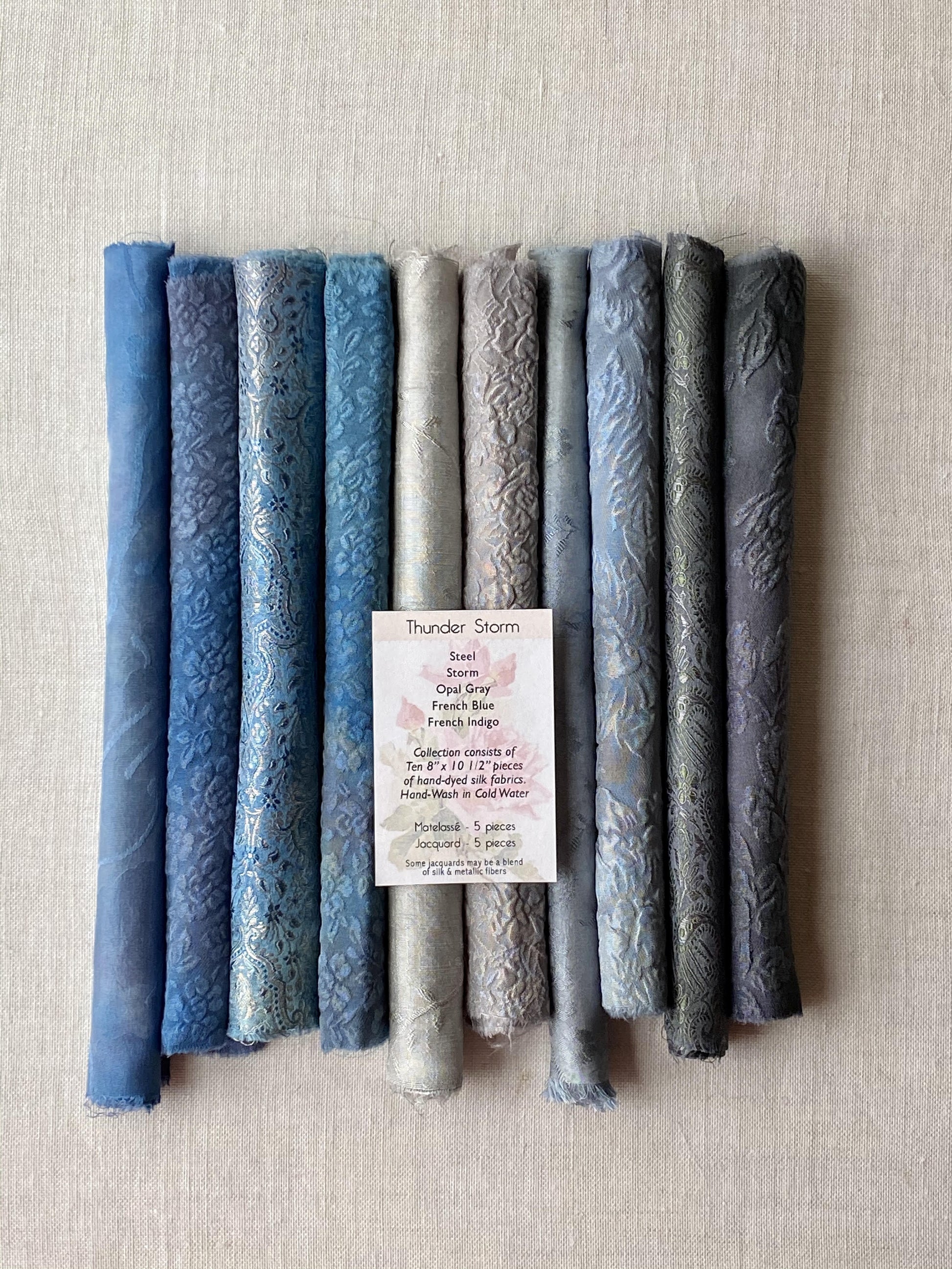 10 piece collection includes 5 Jacquards and 5 matelassés in colors: Steel, Storm, Opal Grey, French Blue and French Indigo. Each piece about 8 x 11 inches.