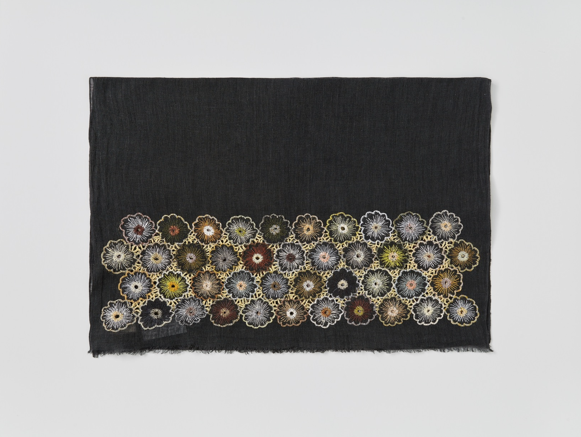 Hand-made linen stole, black background, light blue, orange and yellow stitching.